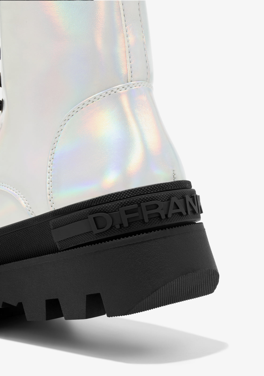 This D.Franklin model in white with a textured finish features an inner zipper on one side and adjustable cotton laces. Its track-style sole provides unmatched grip. It also features our logo and emblem embossed on the wedge and toe.