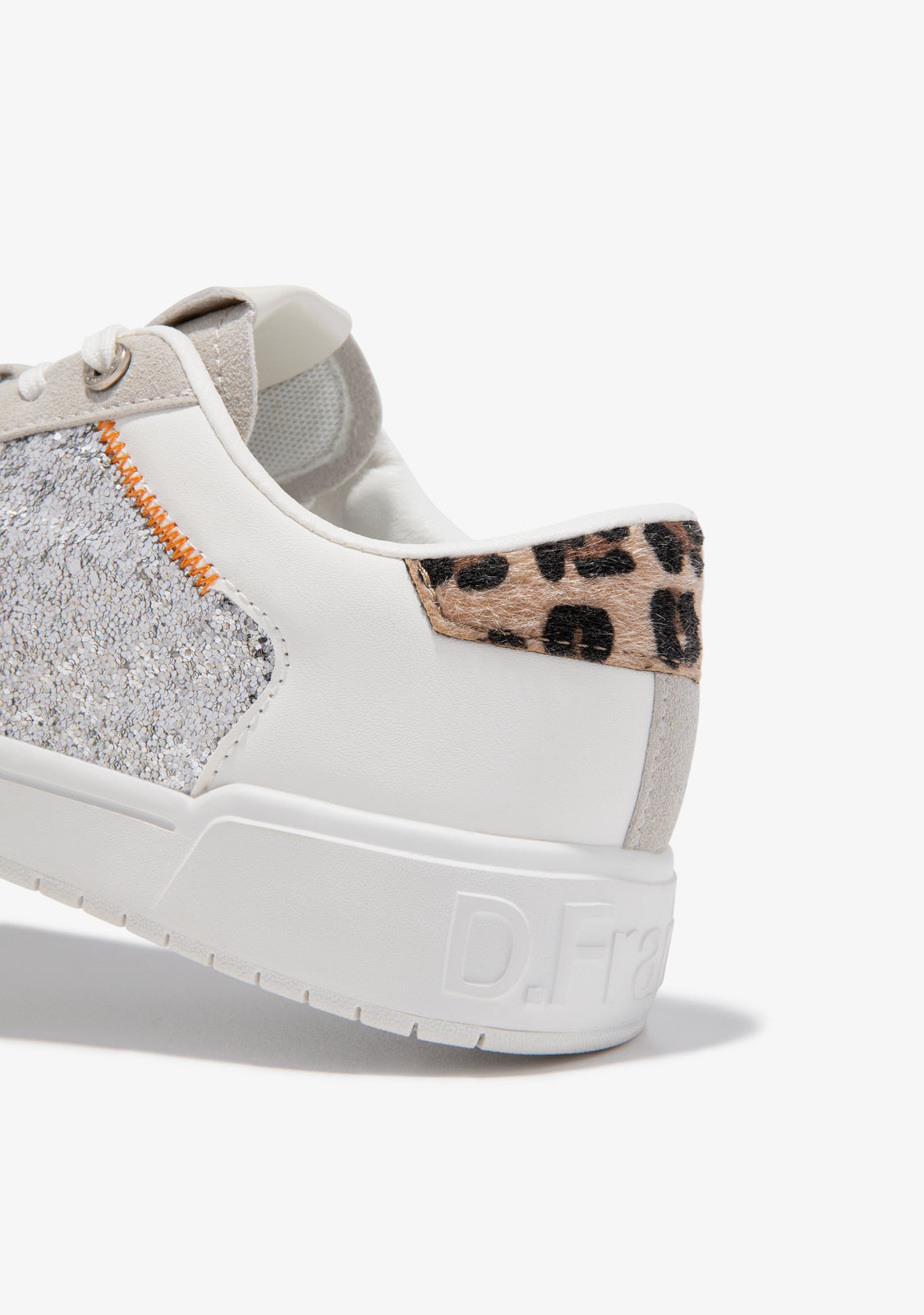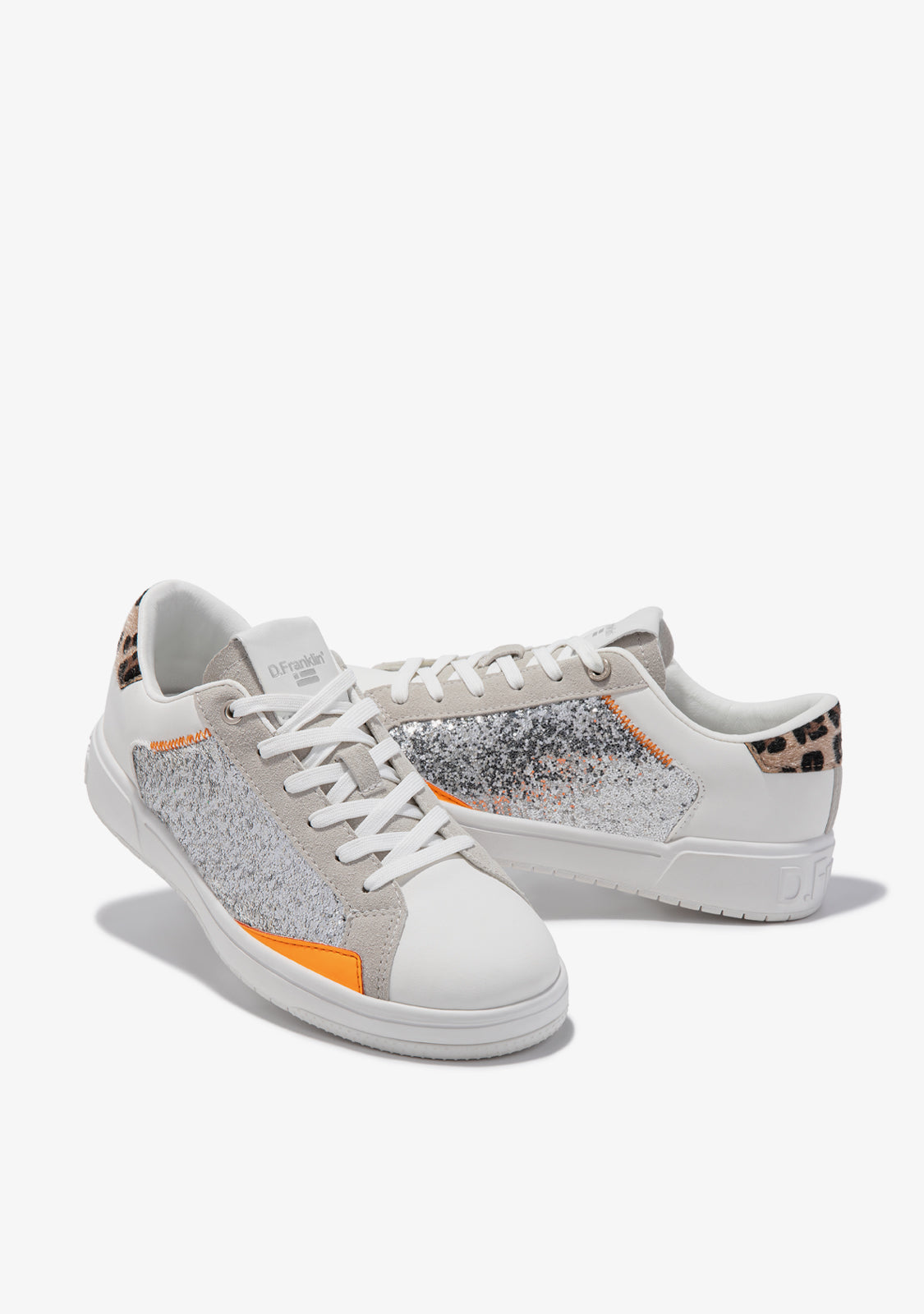 The Court V2 Tennis Basic Glitter Silver Leo D.Franklin model is made with white, orange and glitter silver details as well as leopard print. They feature a logo-embossed sole on the heel, sole and side. With a redesigned 2 cm high sole and phylon sole for lightweight cushioning. The anatomical footbed is also removable.