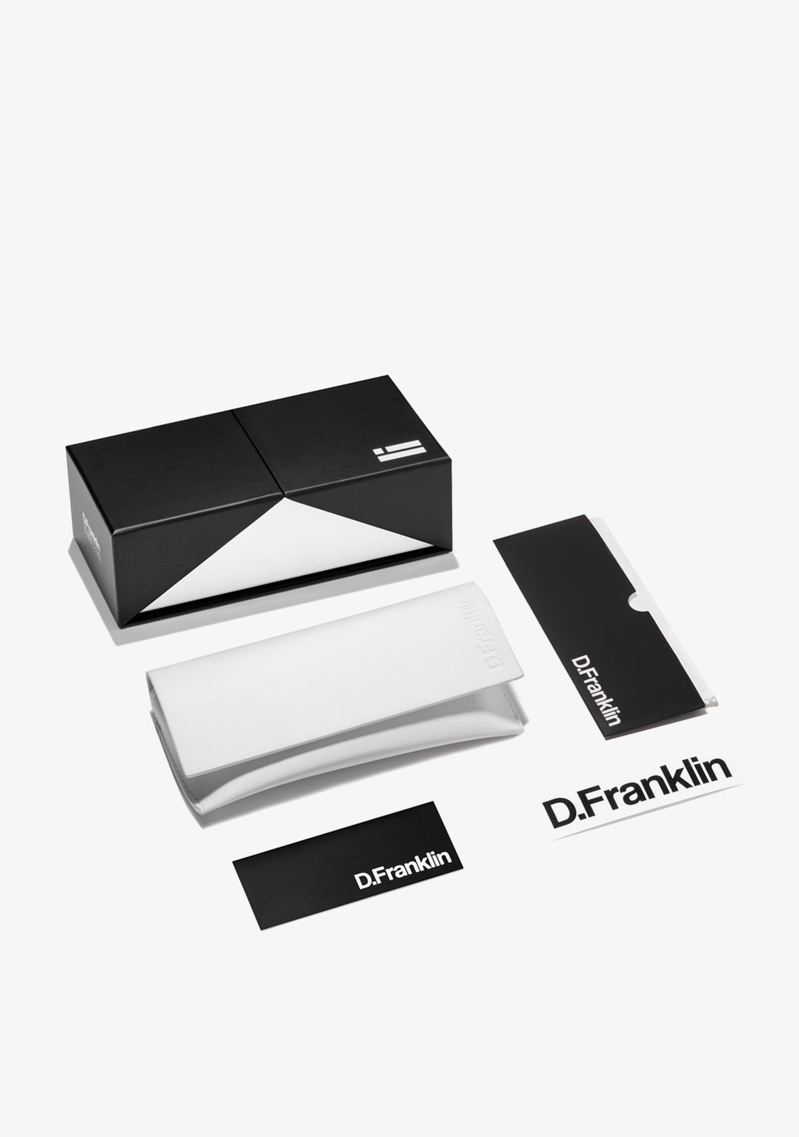 Smoked polarized lenses and a green frame enhance the aesthetics of this design. It features our signature D.Franklin flag with a metallic gold finish on both temples. With a lens width of 52mm and a 141mm front frame, these glasses will flatter most faces. The side temples have a length of 140 mm.
