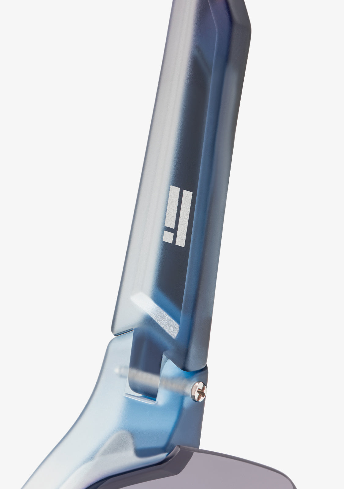 The Hurricane Blue model stands out for its aerodynamic frame and distinctive finish. It features a 142 mm front and 152 mm lenses, precisely designed to optimize airflow and reduce wind resistance. The 140 mm temples display our emblem on both sides, while silicone pads on the tips and nose bridge ensure a secure and comfortable grip.