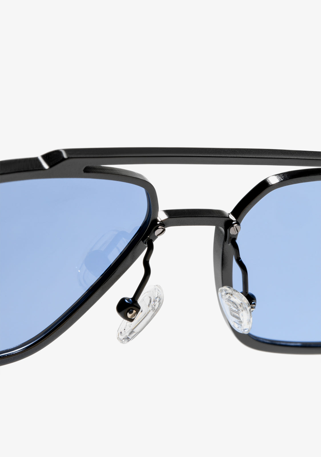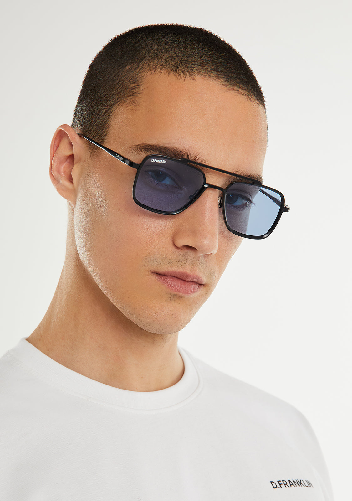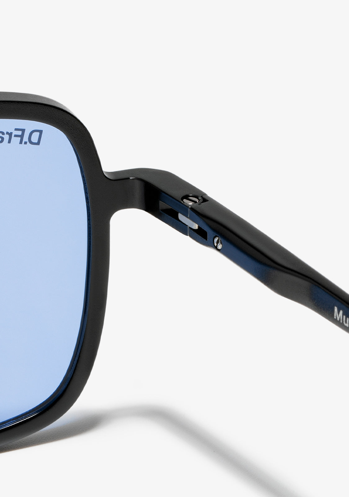 Thanks to their aluminium construction, these glasses are ultra-lightweight. Blue polarized lenses and a black frame reinforce the distinctive design. These sunglasses feature our emblem on the right lens and a metallic logo on the side of the temples. It also has a 140mm front frame and 50mm lens width, which fits most faces. The temples are 138 mm long.
