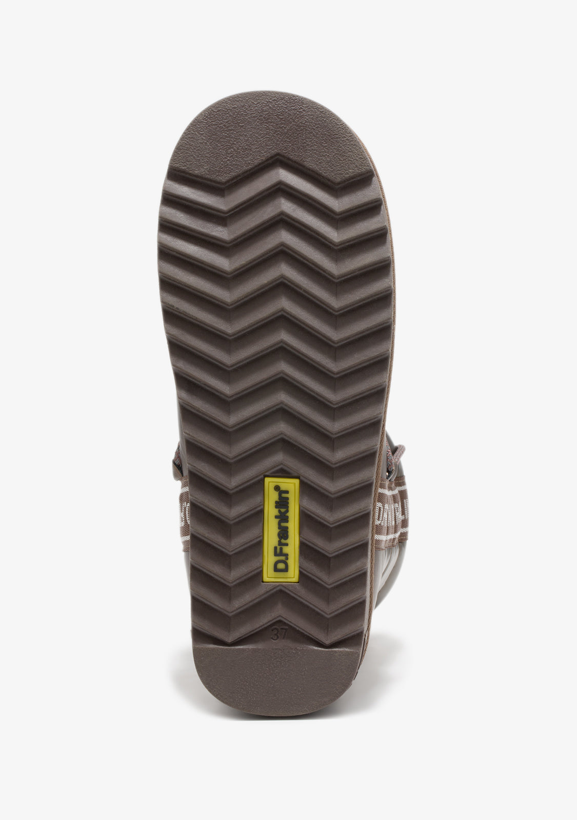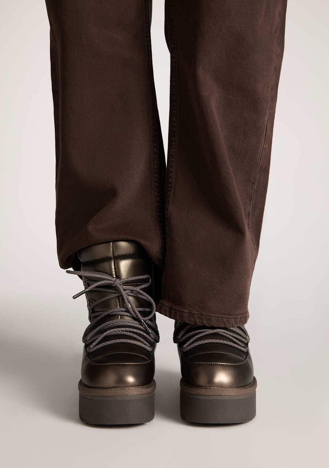 Straight-cut shaft design in bronce tones, shiny aesthetic, and synthetic inner lining for superior warmth.