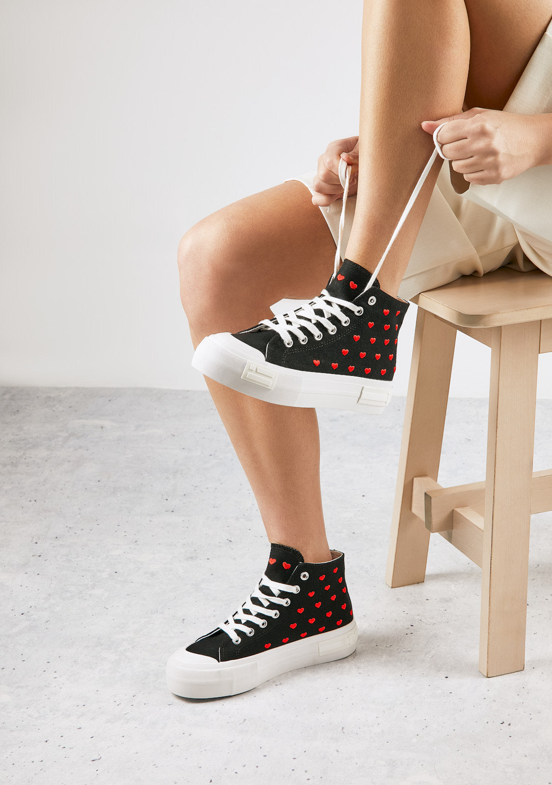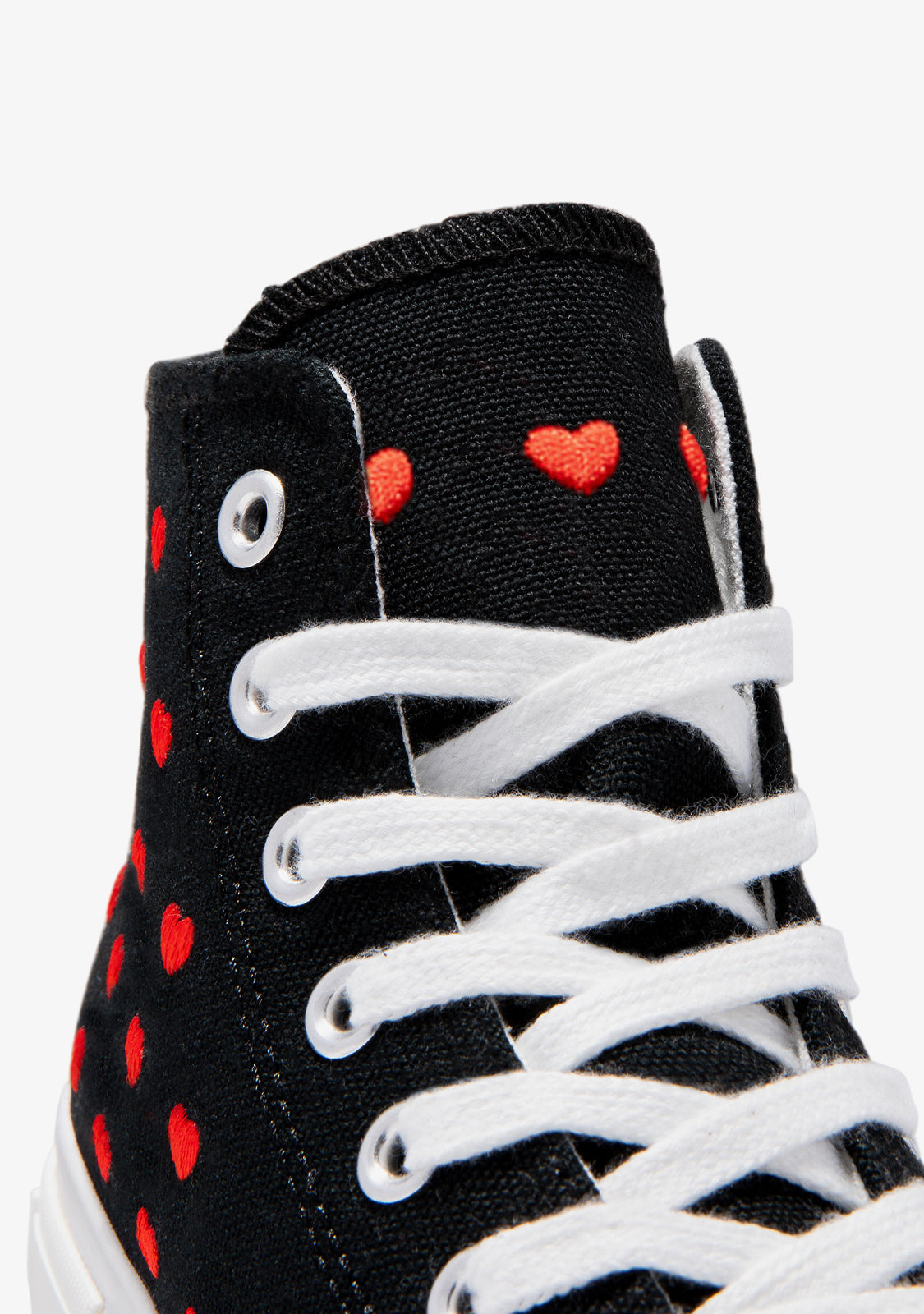 This One Way model is made of canvas textile with a dark design of embroidered hearts. White rubber sole and personalised lettering on the heel. It has a height of 4 cm and features our flag emblem on the side.