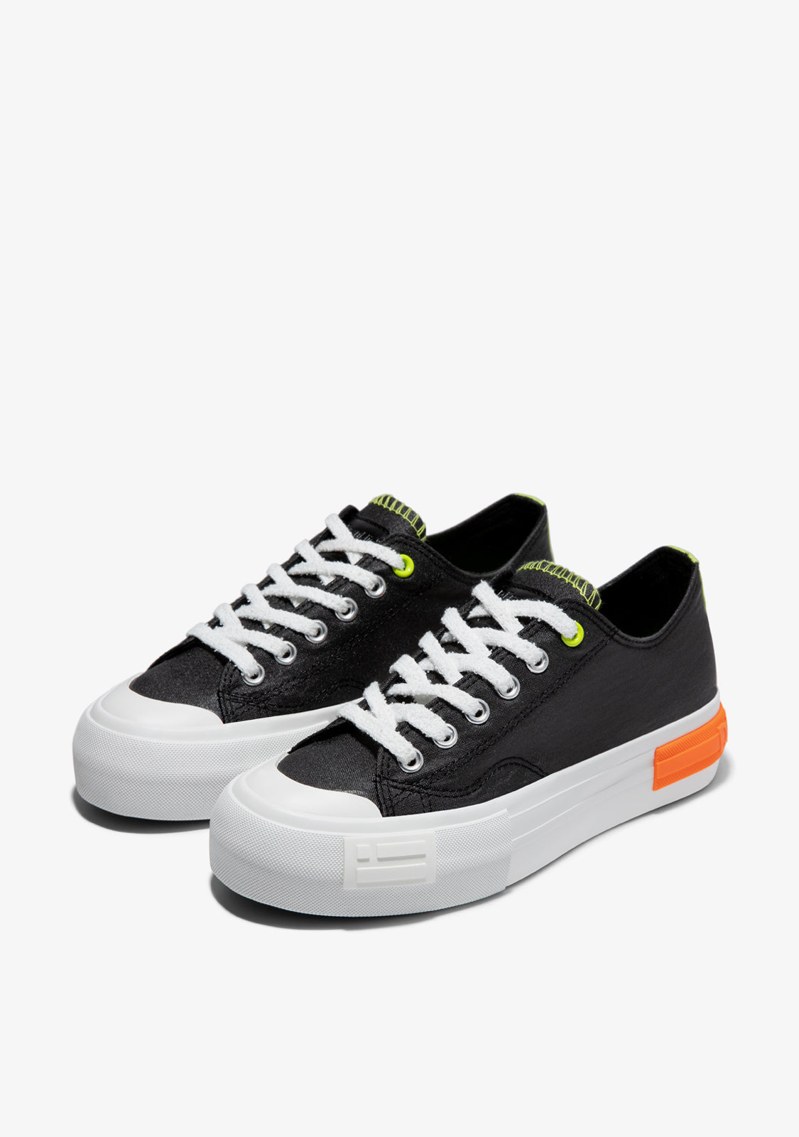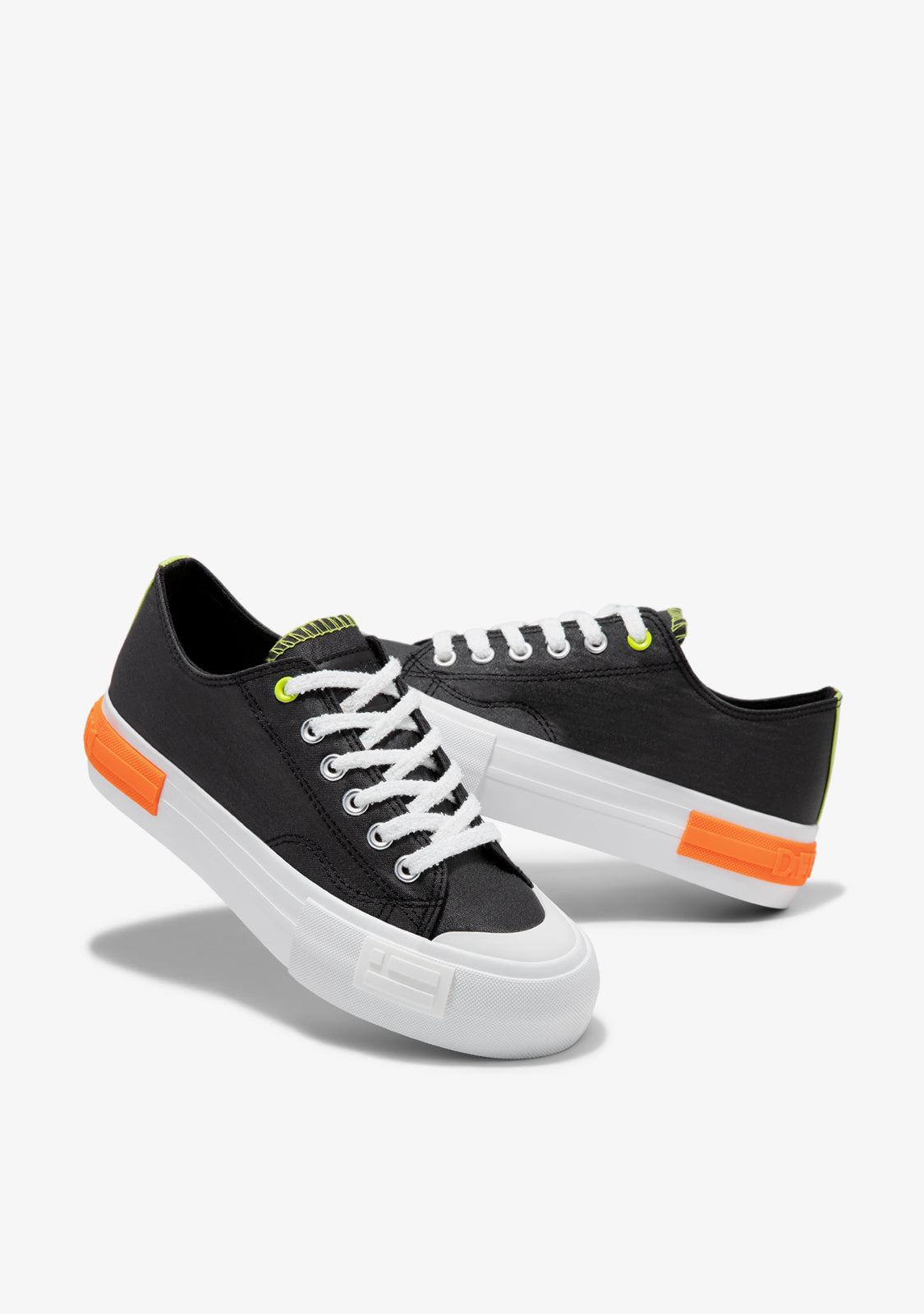 Our black One Way design is constructed from canvas textile. White rubber sole and orange lettering detail. Featuring a 4cm height and our flag emblem on the side.