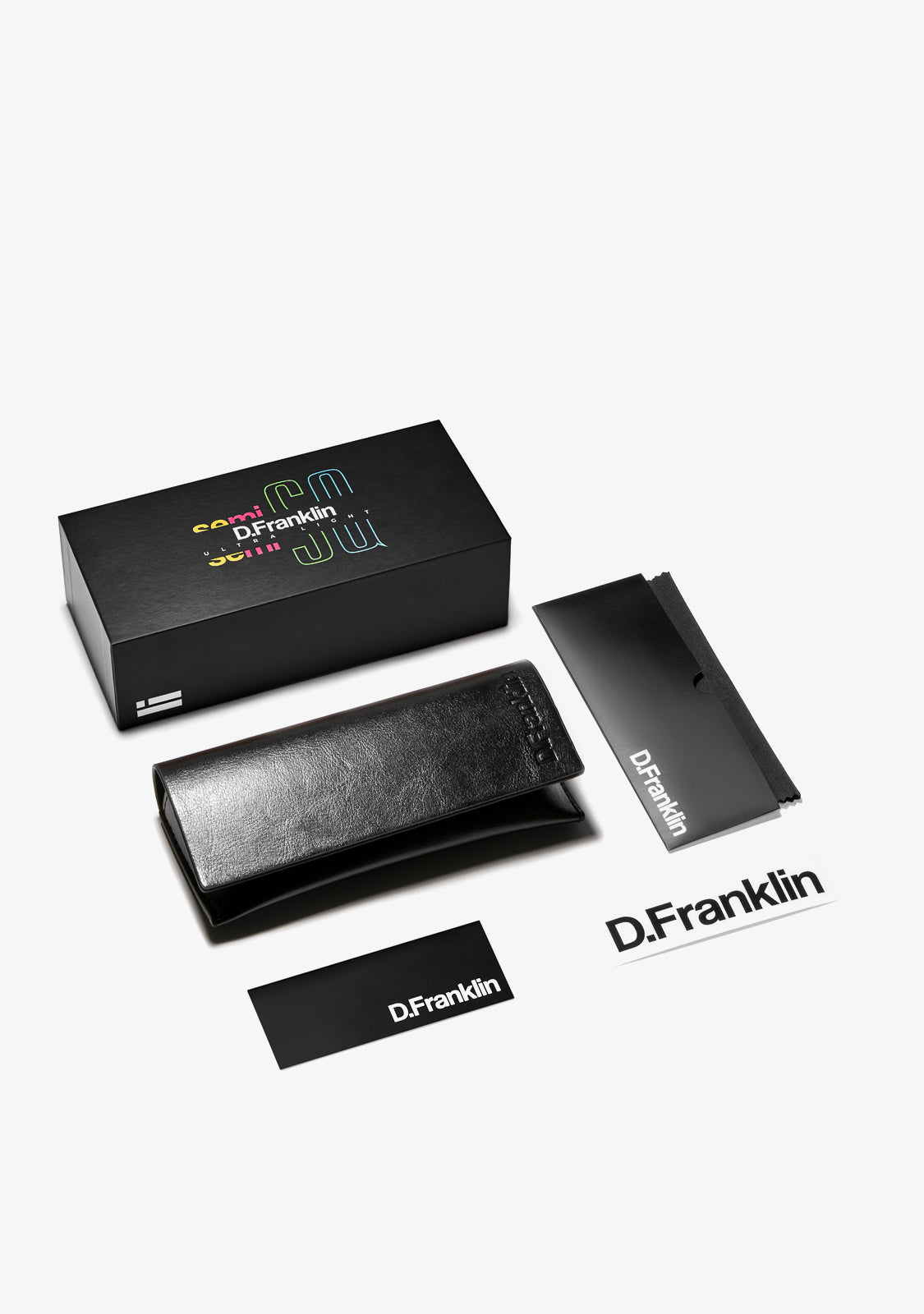 Our black Ultra Light S Square model features our signature D.Franklin details: logo engraving on both temples and our emblem on the right lens. The lens width is 46 mm and the front is 140.5 mm. The side temples have a length of 145 mm.