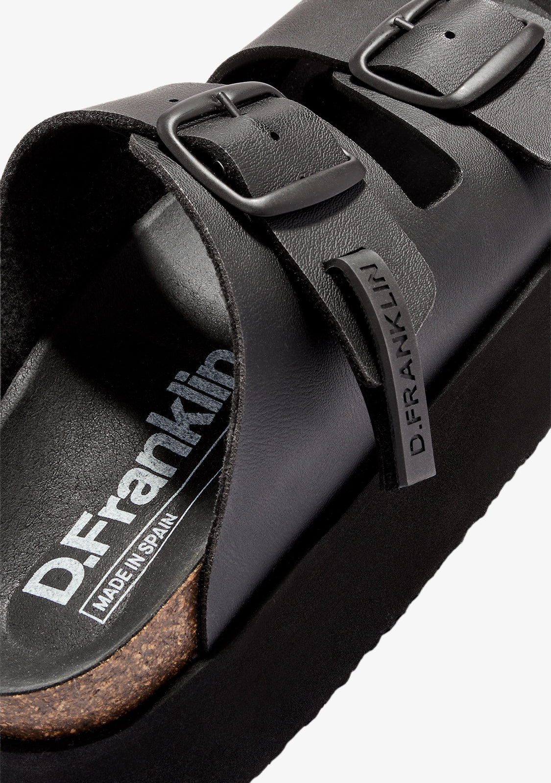 Discover the perfect blend of style and comfort with the Vibe Sandals Buckle Platform Champion Black sandals by D.Franklin. Crafted from eco-leather, they offer a premium finish that complements any look.