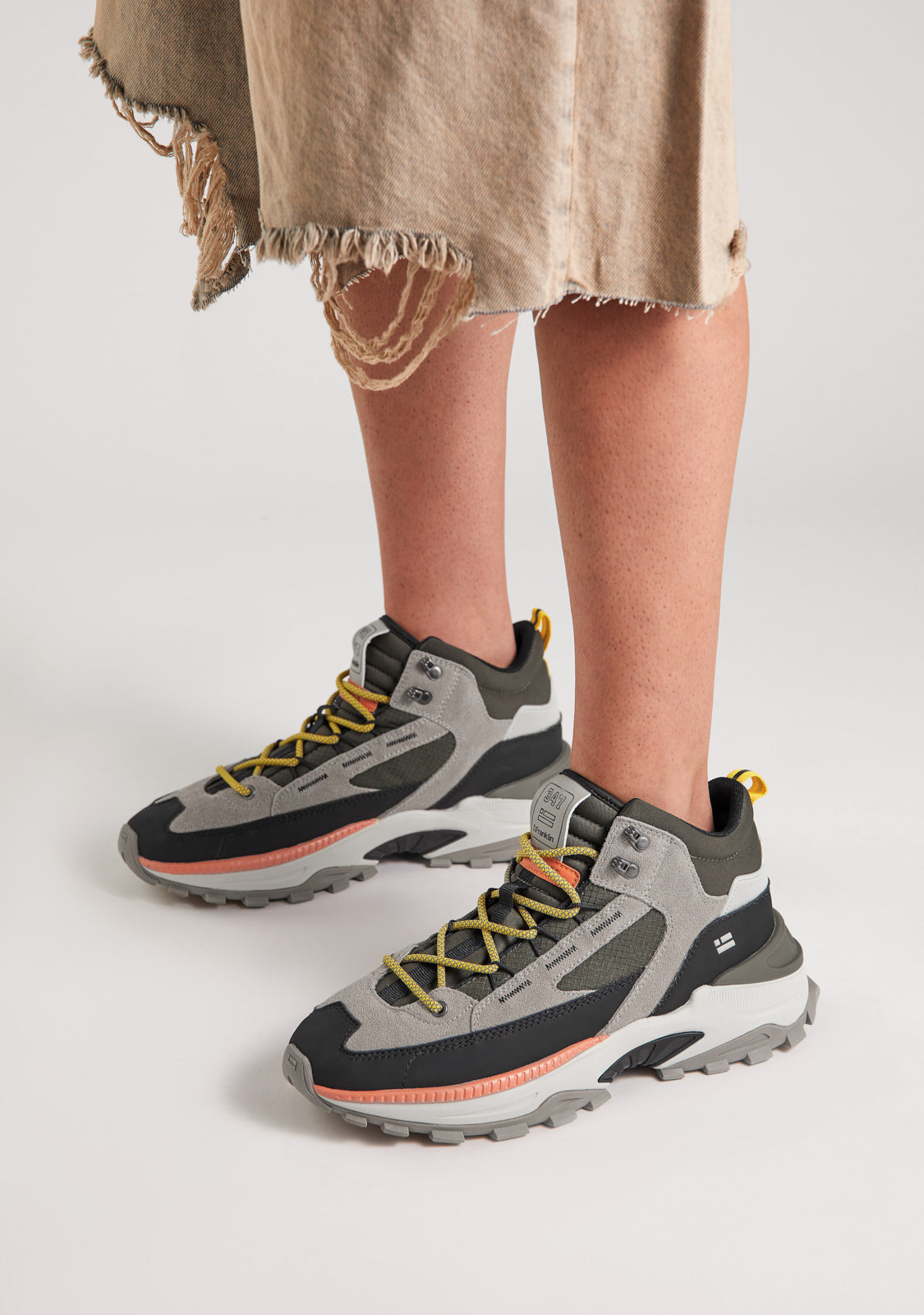 Design de bota de tornozelo elaborado com detalhes em pele e materiais sintéticos de alta qualidade. O nosso modelo 347 apresenta um acabamento robusto em tons de cinza, caqui e preto. Destaca a nossa bandeira e lettering no calcanhar e possui um fecho de atacadores ajustável com ilhós.