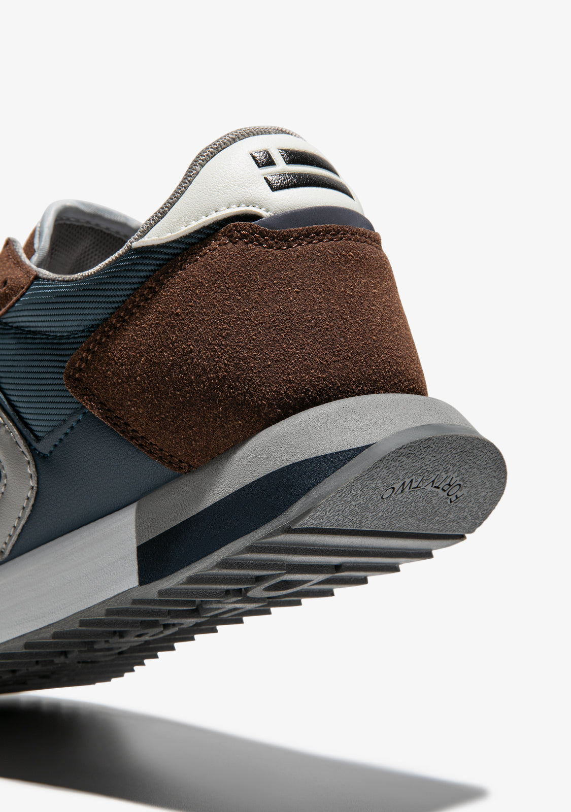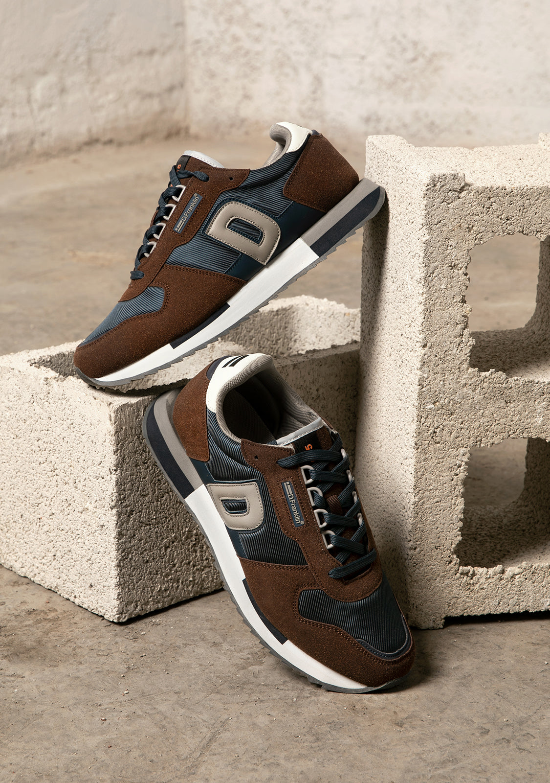 Este modelo tem uma estética clássica em cores castanhas com detalhes cinzentos. Apresenta a letra D do nosso emblema na lateral. Também possui atacadores de algodão para um ajuste perfeito. A sola serrilhada de dupla densidade proporciona um ajuste confortável, leve e boa aderência.