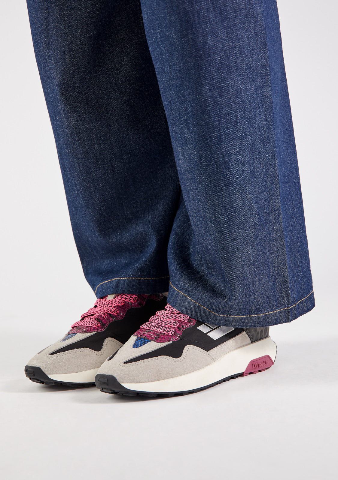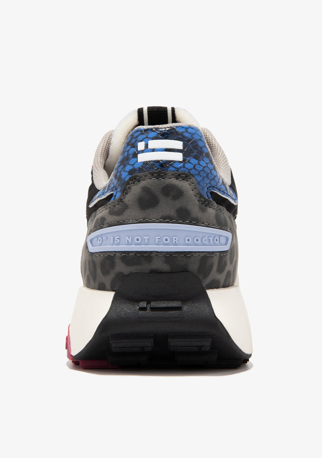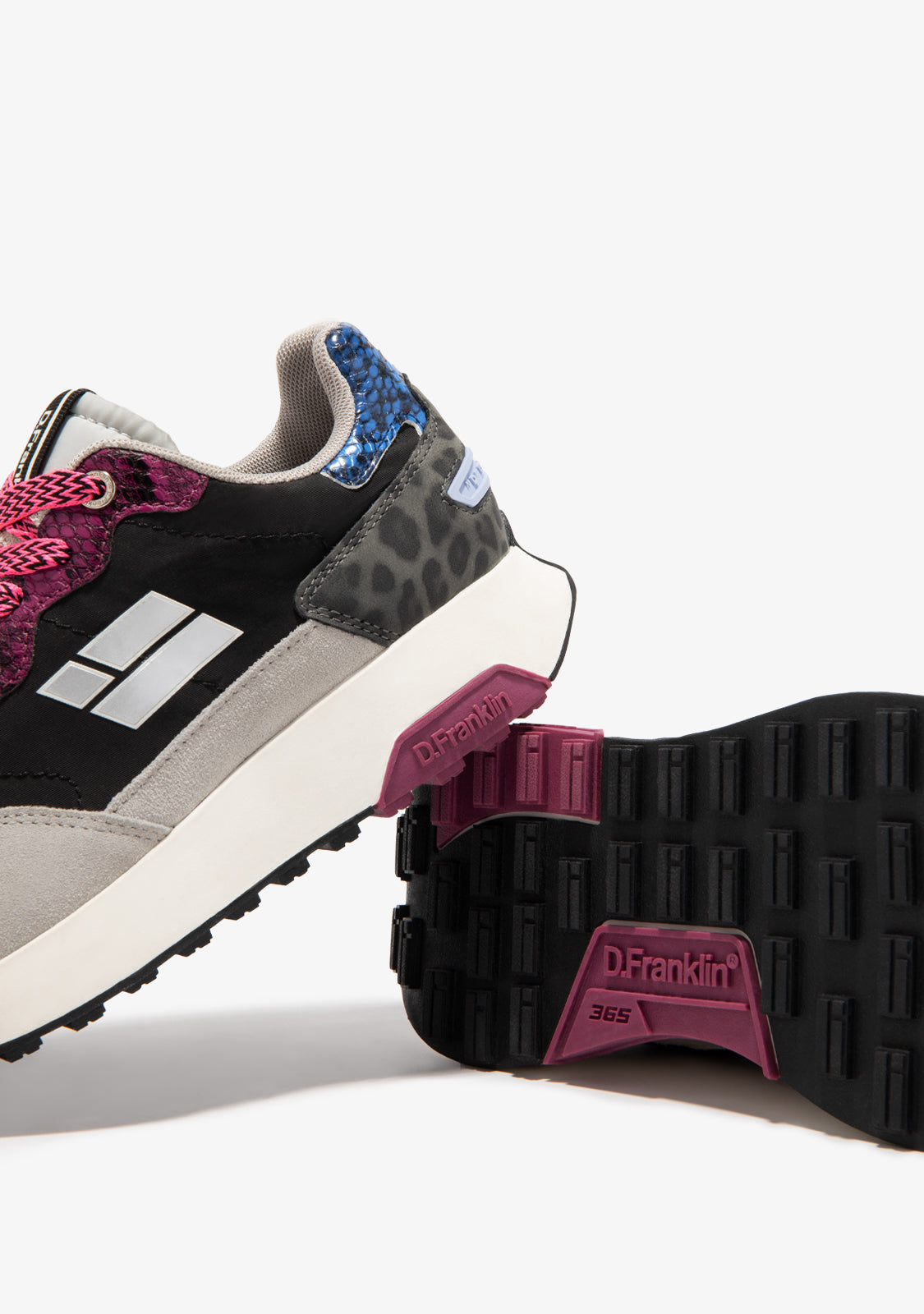 Este modelo funde diferentes estampas de animais com tons de preto, violeta e azul que destacam a sua singularidade. Tem a bandeira D.Franklin na lateral e cordões impressos para um ajuste perfeito. Além disso, possui uma sola de duas densidades. A primeira é feita de materiais reciclados para uma pisada confortável e leve, e a segunda é em relevo para proporcionar aderência.