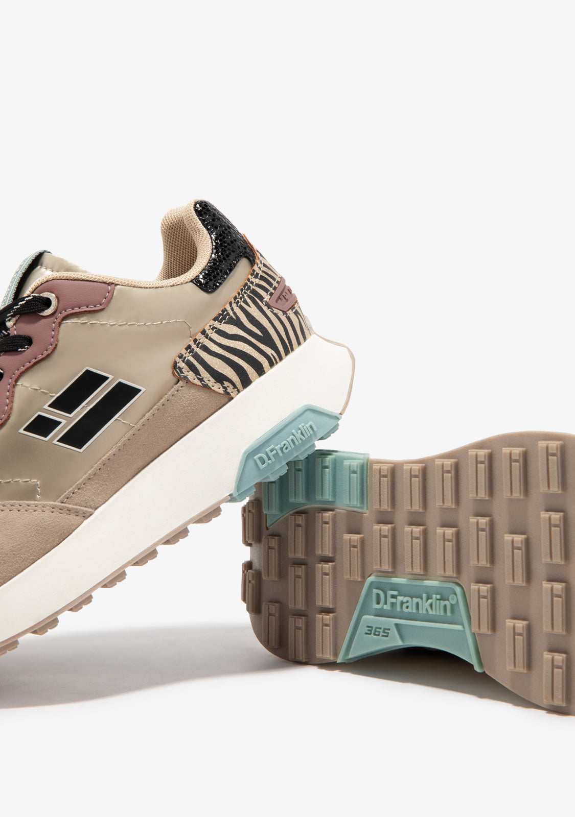 Este modelo funde diferentes texturas com tons dourados e beges que destacam a sua unicidade. Apresenta a bandeira D.Franklin na lateral e atacadores impressos para um ajuste perfeito. Além disso, possui uma sola de duas densidades. A primeira é feita de materiais reciclados para uma pisada confortável e leve, e a segunda é em relevo para proporcionar aderência.