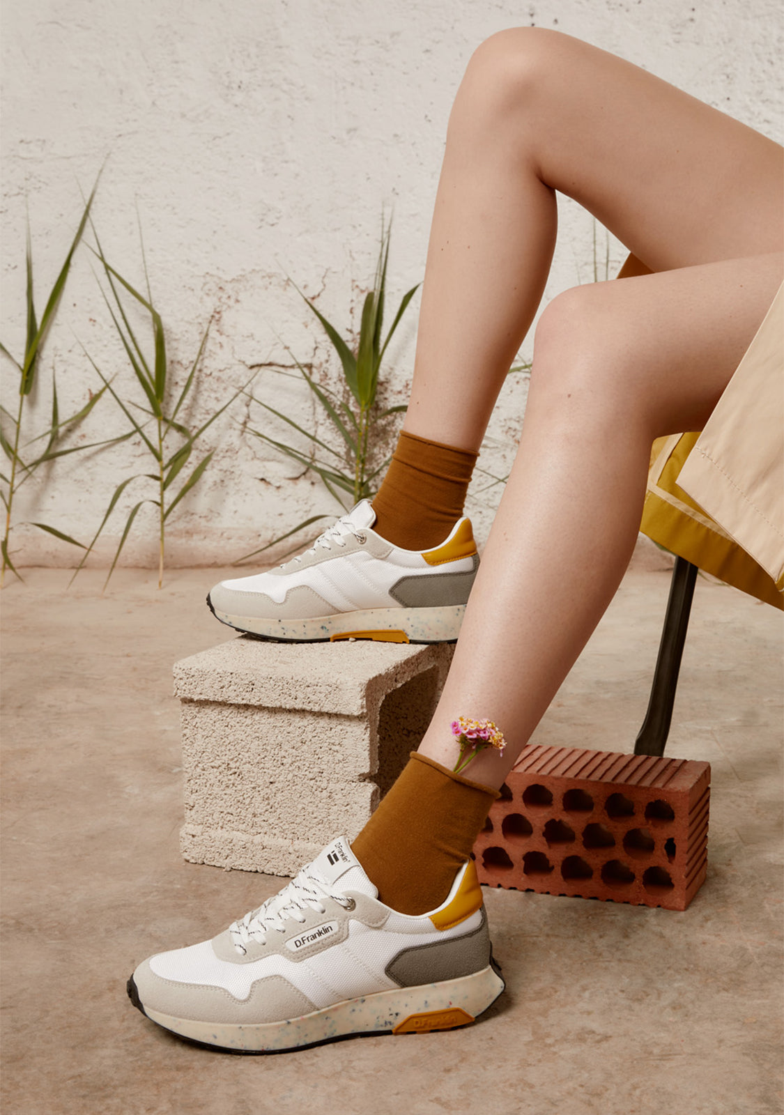 Tênis em tons neutros D.Franklin, projetados para a rotina urbana. Com uma silhueta atualizada criada para caminhar pelas ruas que nos inspiram e romper com o dia a dia.