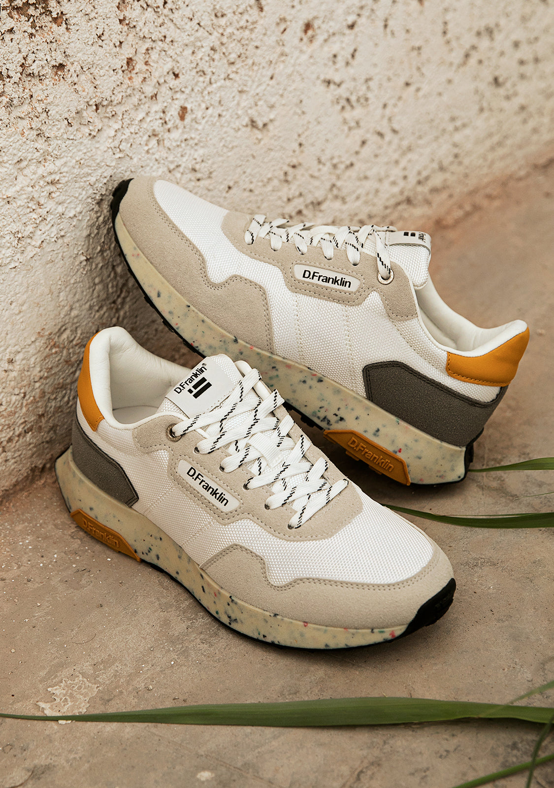 Este modelo combina a simplicidade dos tons neutros num design que se destaca pela sua singularidade. Apresenta a marca D.Franklin na lateral e atacadores de algodão para um ajuste perfeito. Também possui uma sola de duas densidades. A primeira é feita de materiais reciclados para um pisar confortável e leve, e a segunda é em relevo para proporcionar aderência.