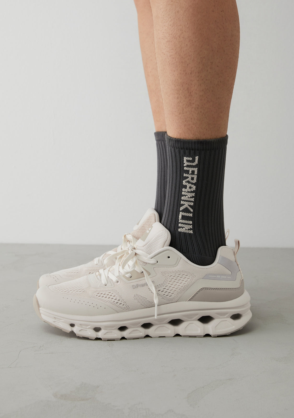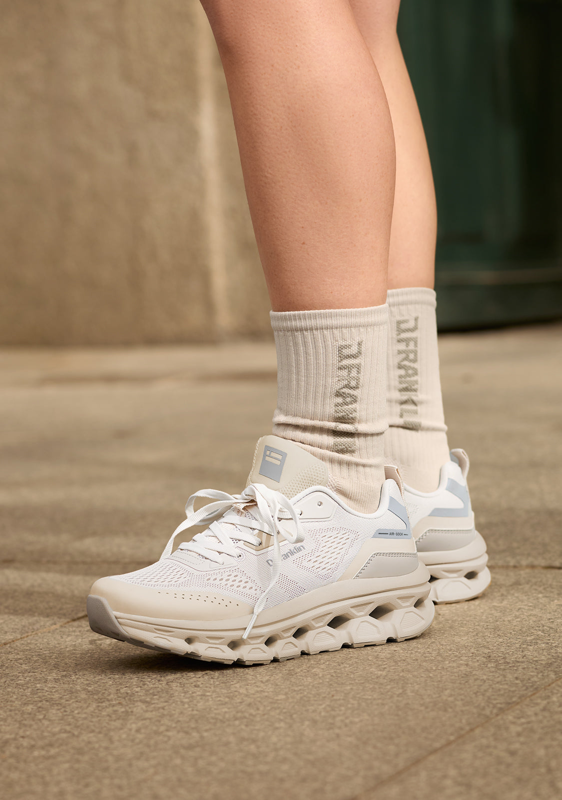 O Aero Dual Beige da D.Franklin é projetado para corrida e treino diário, com um ajuste regular e fecho de cordões para uma fixação segura. A sola de plataforma proporciona um elevador estável, respaldado pela Biomechanical Run Comfort Validation.