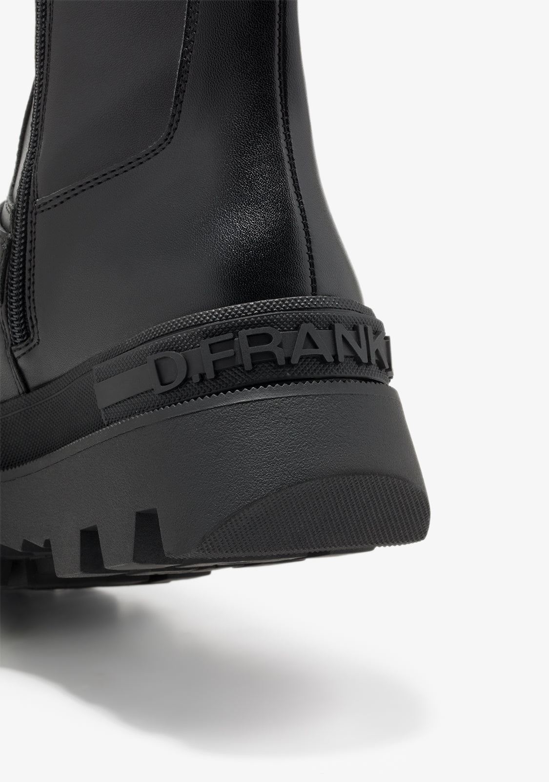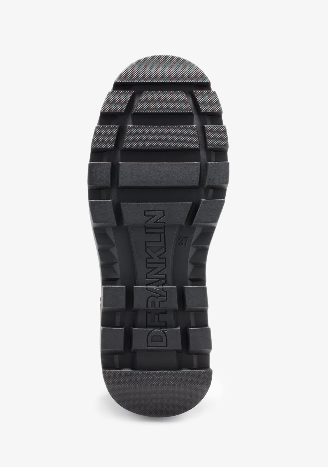 Este modelo D.Franklin em preto apresenta um fecho de correr interior de um lado para um ajuste perfeito. A sua sola de estilo pista proporciona uma aderência incomparável. Apresenta o nosso logótipo e emblema embutidos no cunho e na ponta. Além disso, possui os detalhes icónicos da fivela na parte inferior e superior, acrescentando à sua estética característica.