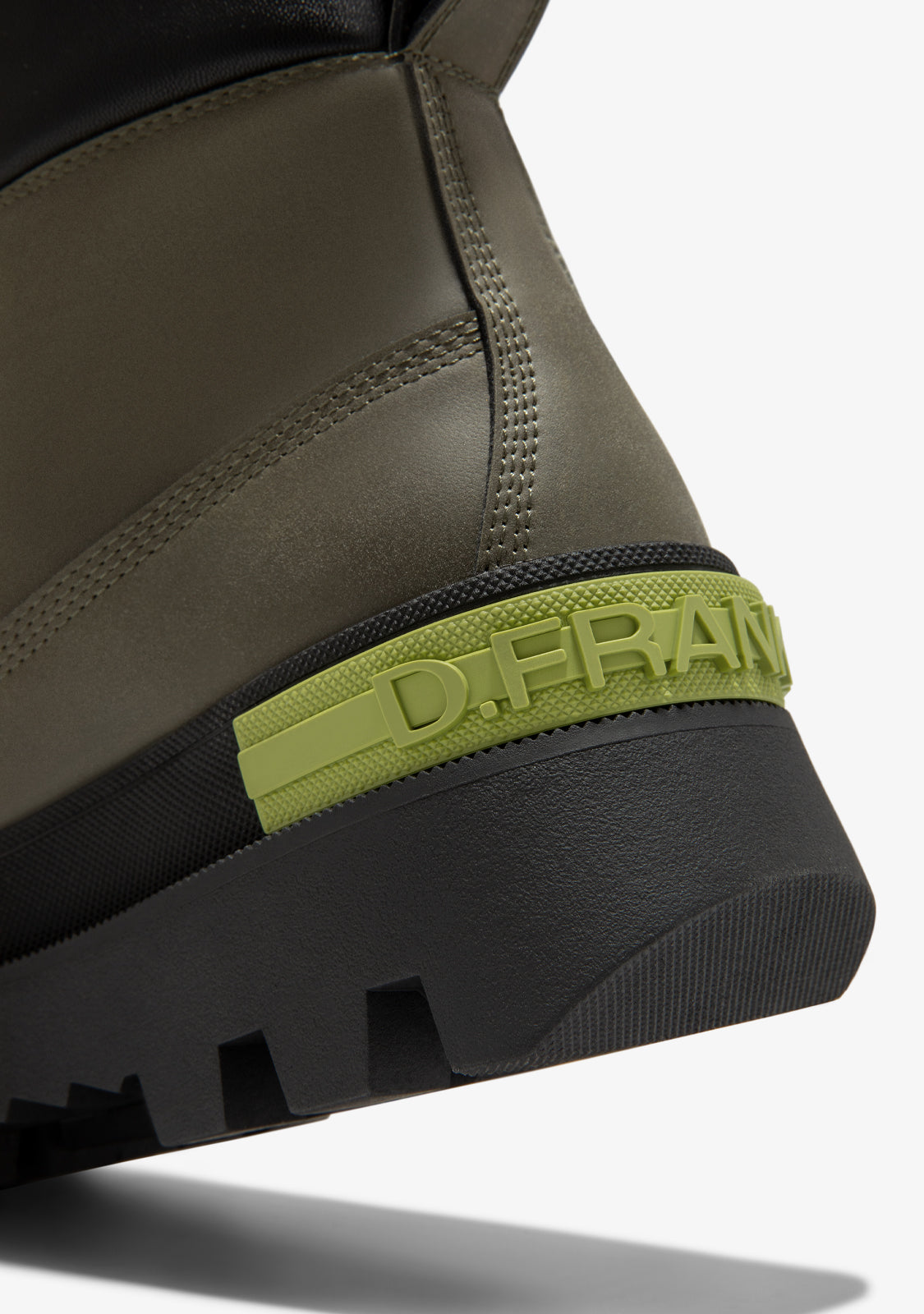Este modelo D.Franklin em caqui apresenta um sistema de atacadores estilo trilha. A sua sola estilo pista proporciona uma aderência incomparável. Também apresenta o nosso logotipo e emblema em relevo no salto e na ponta.