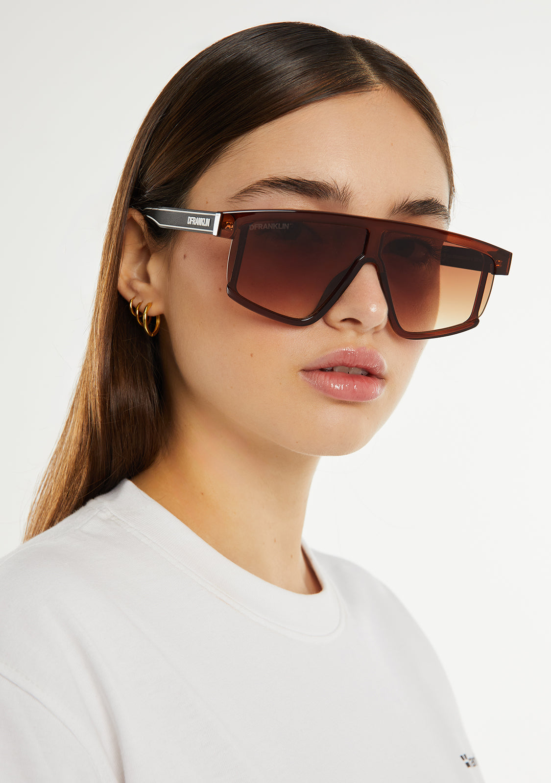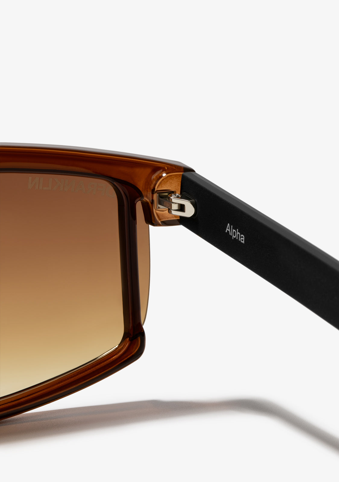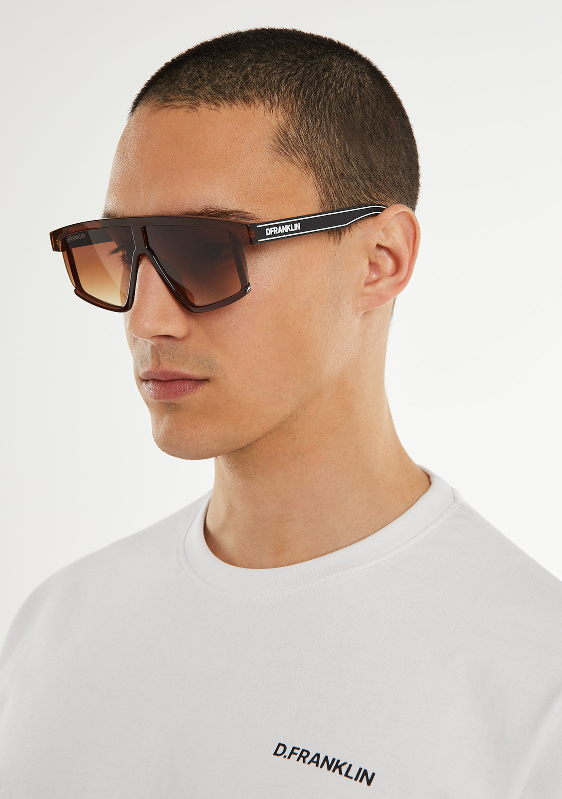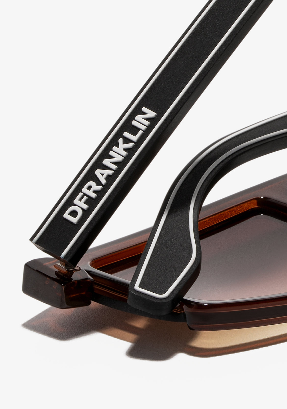 Lentes de policarbonato com tonalidade castanha e armação correspondente destacam a singularidade deste modelo. Com detalhes característicos da D.Franklin: logótipo gravado nas hastes e emblema na lente direita. Com uma largura de lente de 65,5 mm e uma frente de 152 mm, estes óculos servirão para a maioria dos rostos. As hastes laterais têm 150 mm de comprimento.