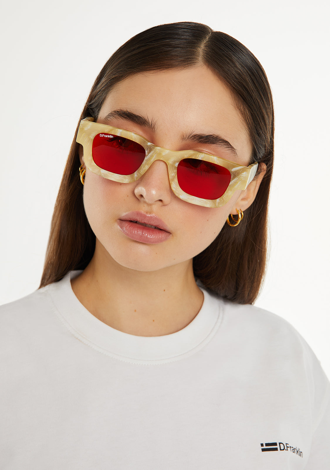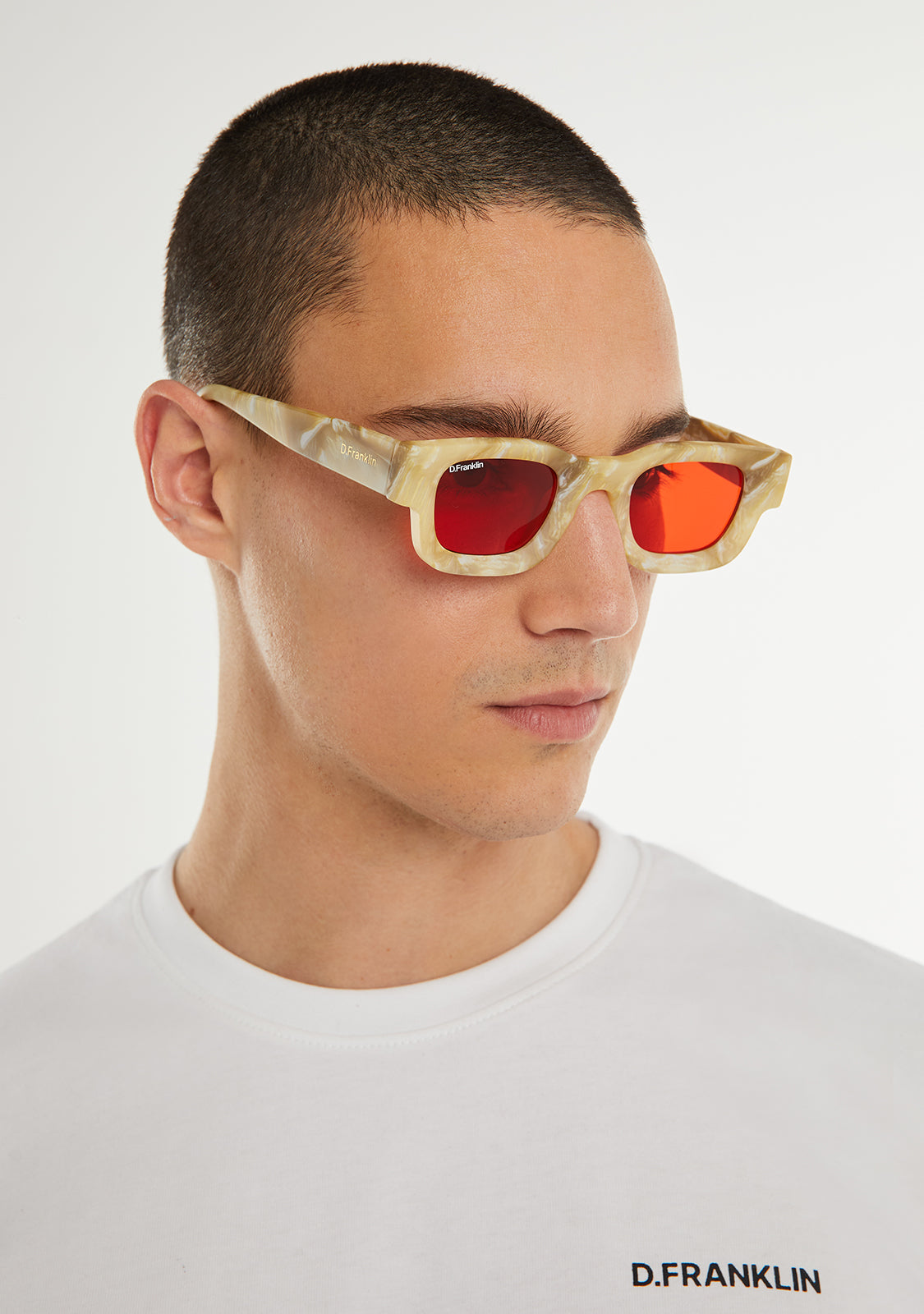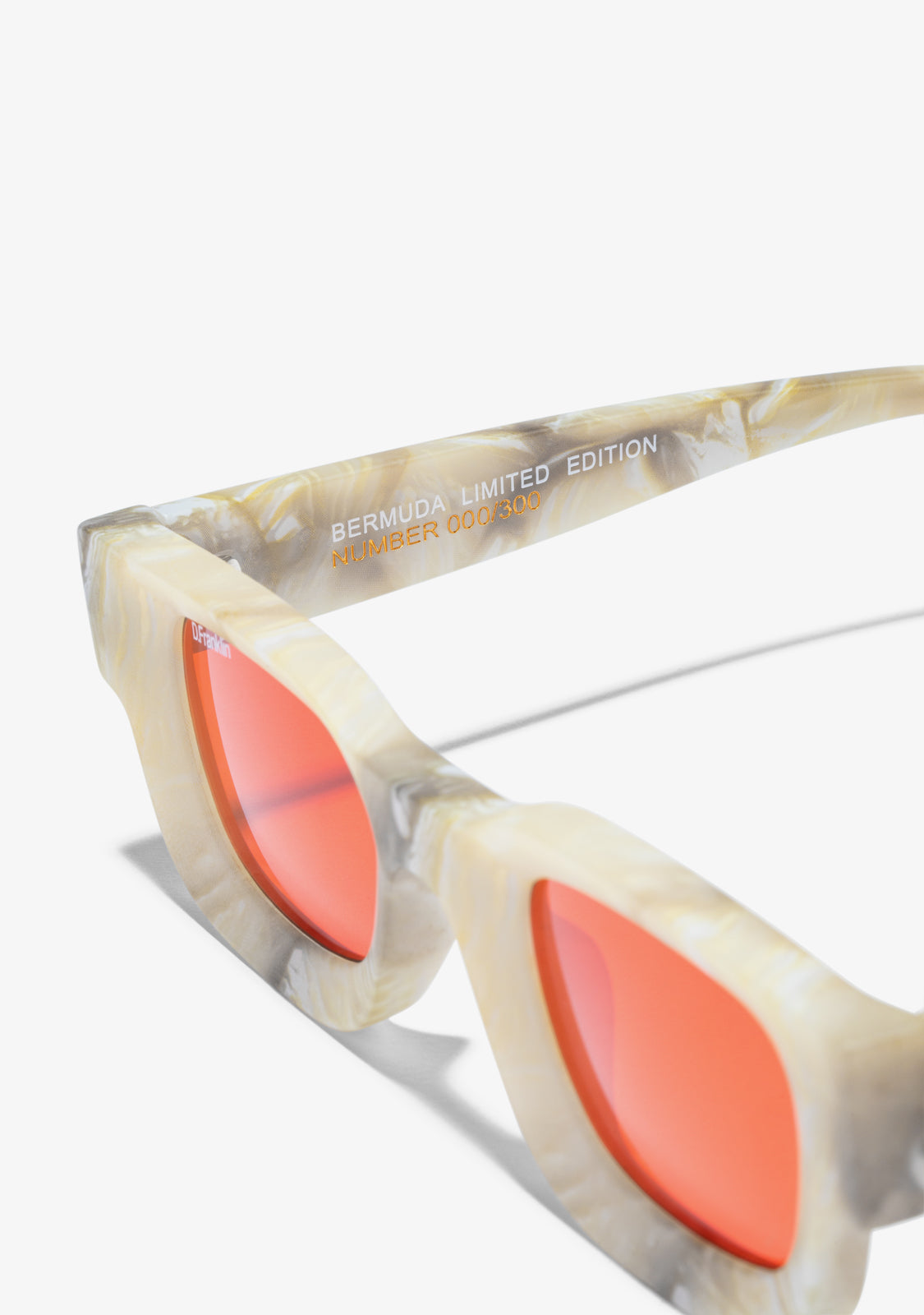 Bermuda White Stone é um design com acabamento mate feito a partir de materiais inspirados em mármore branco. Armações grossas e lentes avermelhadas representam os nossos diferentes prismas, moldados numa silhueta retangular oversized especialmente concebida para interagir com novos espaços.