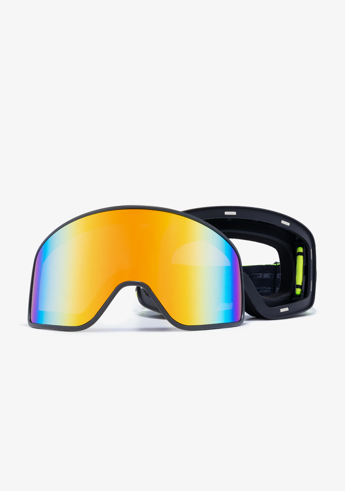 Este modelo inspirado no pico apresenta uma lente espelhada de policarbonato sem limites ou armação. Apresenta um acabamento vermelho e preto com o nosso emblema característico na lateral da sua faixa elástica verde. A largura uniforme da lente é de 179,5 mm.