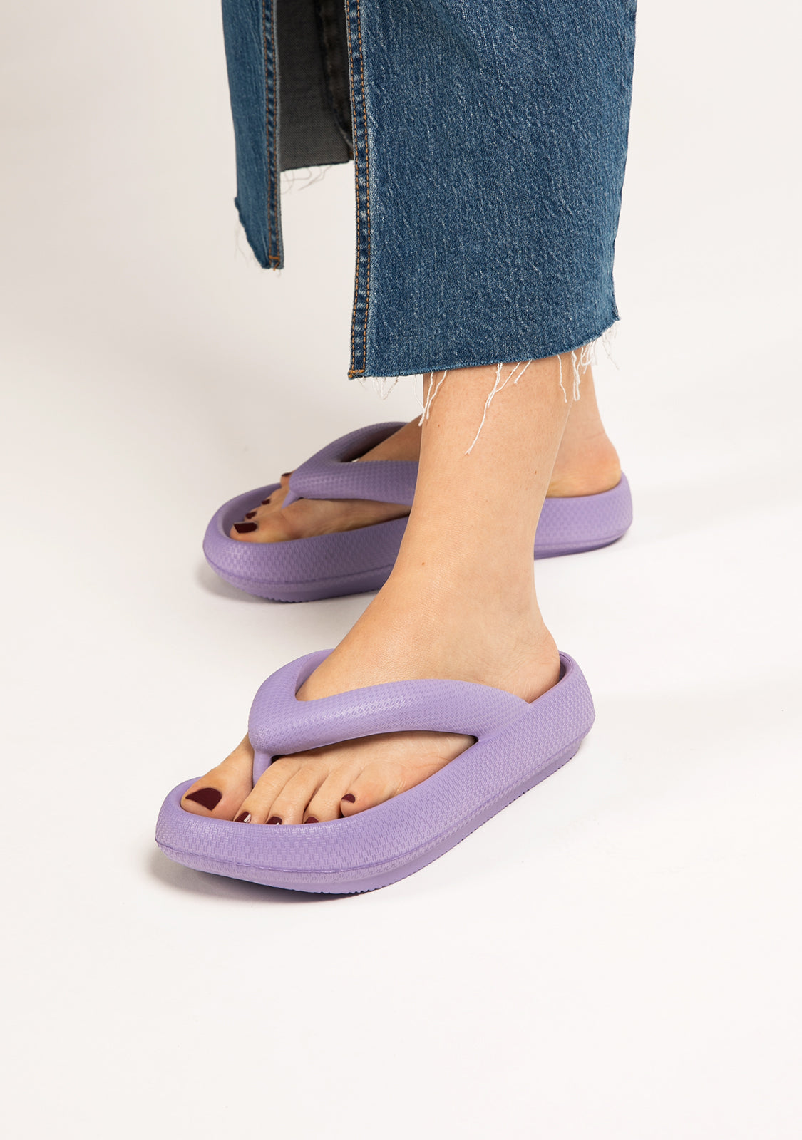 Um tributo aos tons roxos do céu ao pôr do sol do Farol de La Mola em Formentera. Construído com EVA para um passo leve. Projetado com tiras de cor lavanda com uma posição para os dedos. Logotipo D.Franklin na sola. As sandálias Bloomer Nip são ligeiramente pequenas. Recomendamos escolher um tamanho maior do que o habitual.