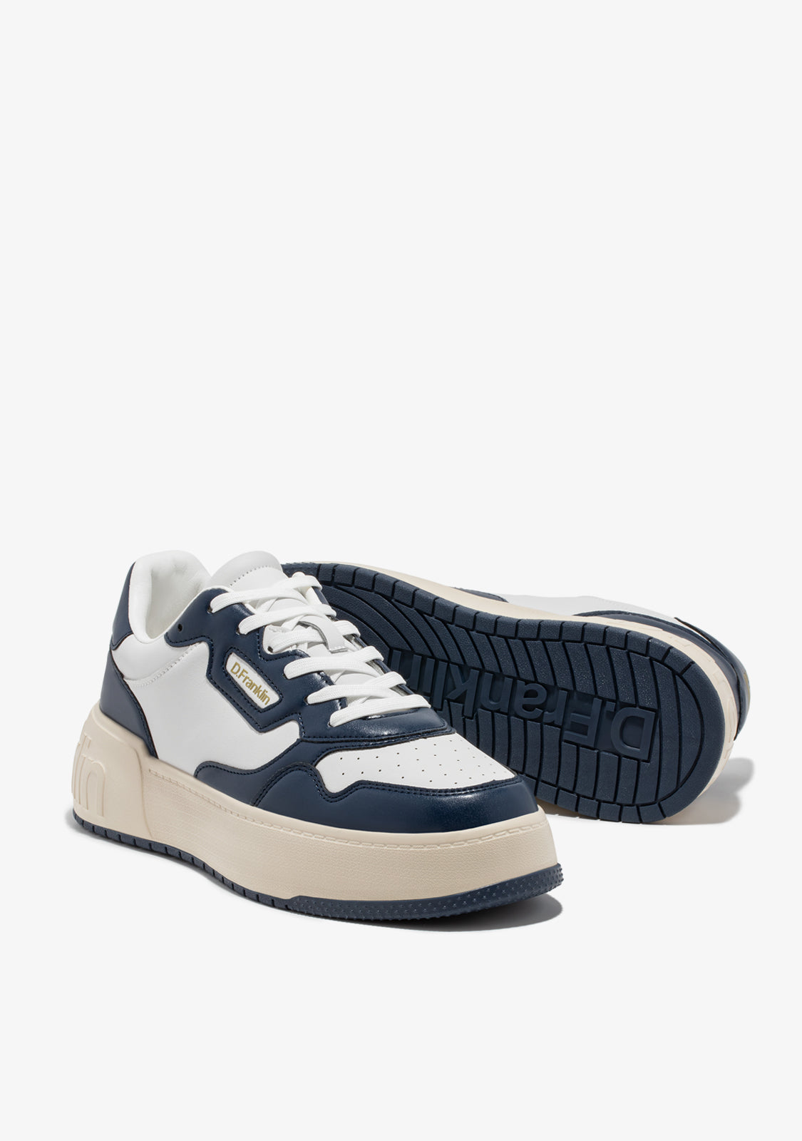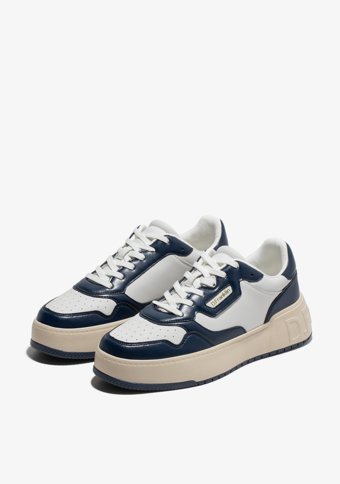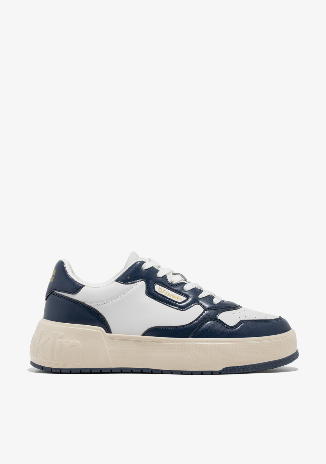 Os ténis brancos Court D.Franklin são elaborados com detalhes em azul marinho e atacadores de algodão. A sola contrastante apresenta um logo em relevo tanto no calcanhar como na sola. Eles têm 4cm de altura e uma sola de phylon para um amortecimento leve.