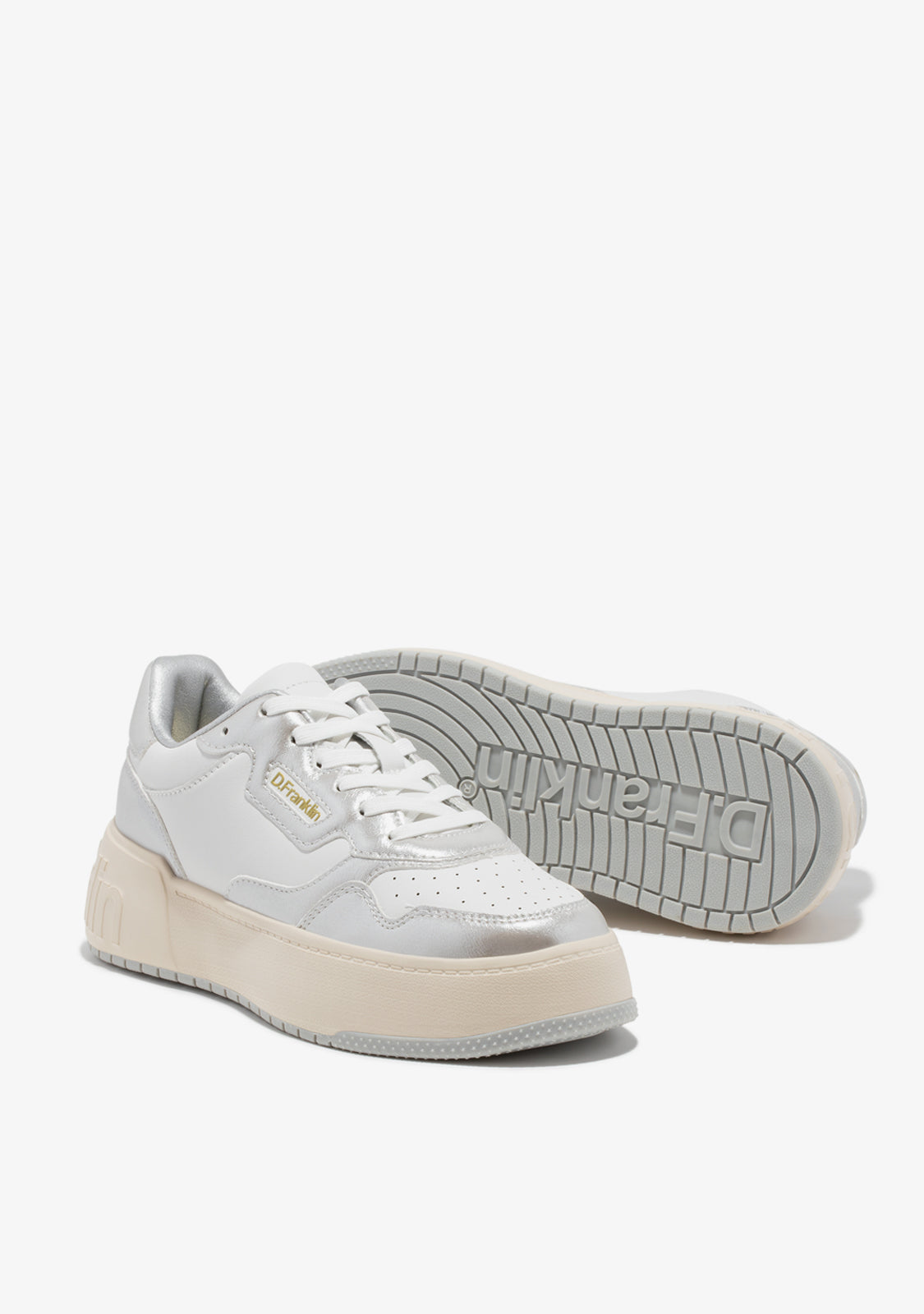 As sapatilhas brancas Court D.Franklin são confeccionadas com detalhes em prata e atacadores de algodão. A sola contrastante apresenta um logótipo em relevo tanto no calcanhar como na sola. Têm 4cm de altura e uma sola em phylon para um amortecimento leve.