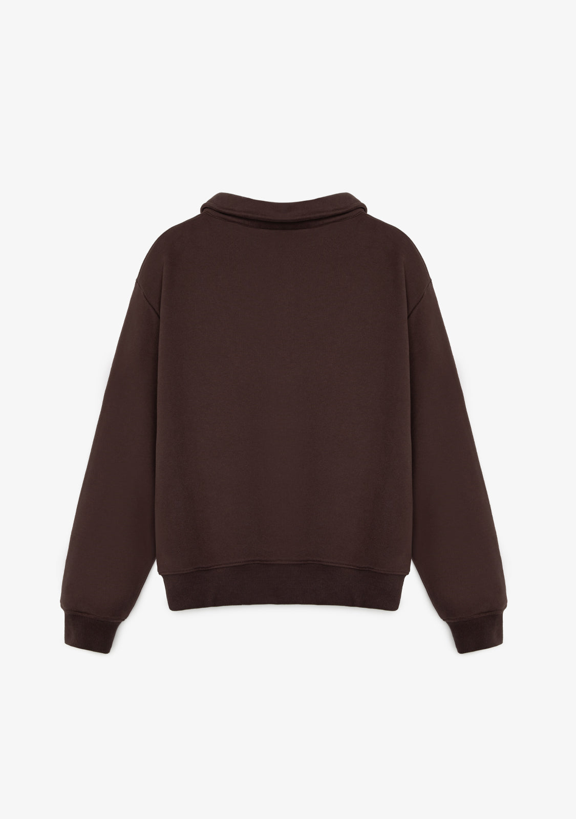 Cropped Polo Sweatshirt Brown é uma sweatshirt feminina que reinventa um corte clássico com um toque moderno. O comprimento cropped e a gola polo tornam-na versátil e cheia de estilo.