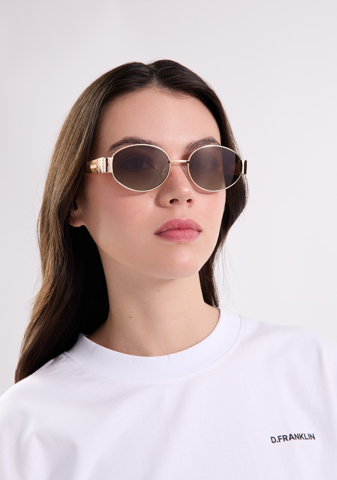 Os óculos de sol Cuprum Round Gold / Gradient Brown da D.Franklin combinam um design intemporal com funcionalidade num modelo elegante e sofisticado. A sua estrutura metálica durável assegura tanto leveza como resistência, enquanto as lentes de policarbonato oferecem proteção total contra UV para um uso confortável e seguro.