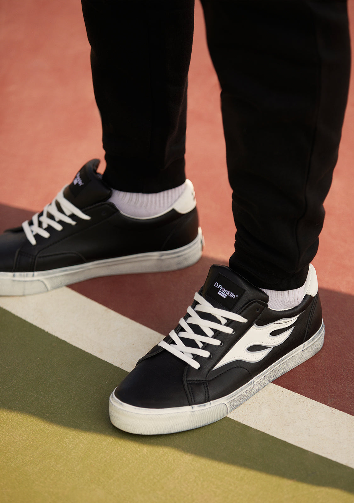 Confeccionadas em pele sintética preta com detalhes em chamas brancas na lateral. Estas sapatilhas apresentam atacadores de algodão, bem como o nosso emblema e bandeira no calcanhar. A sola antiderrapante permite um conforto extra leve ao caminhar.