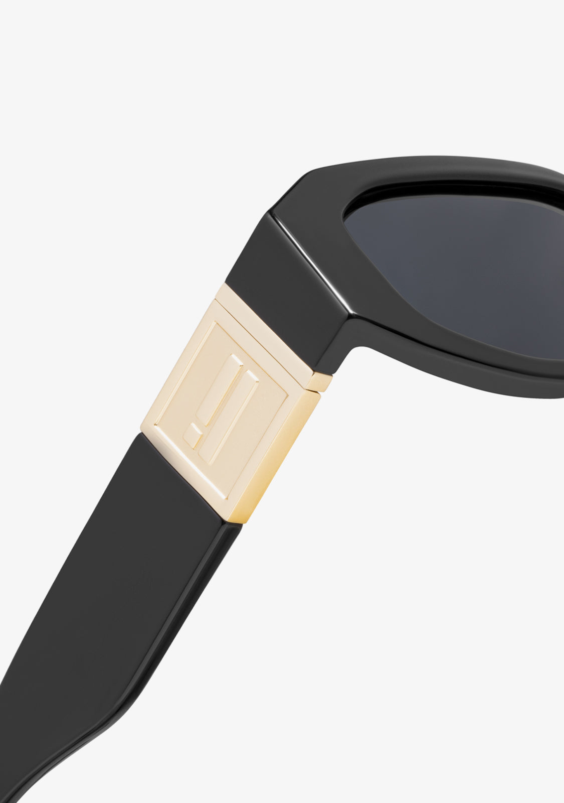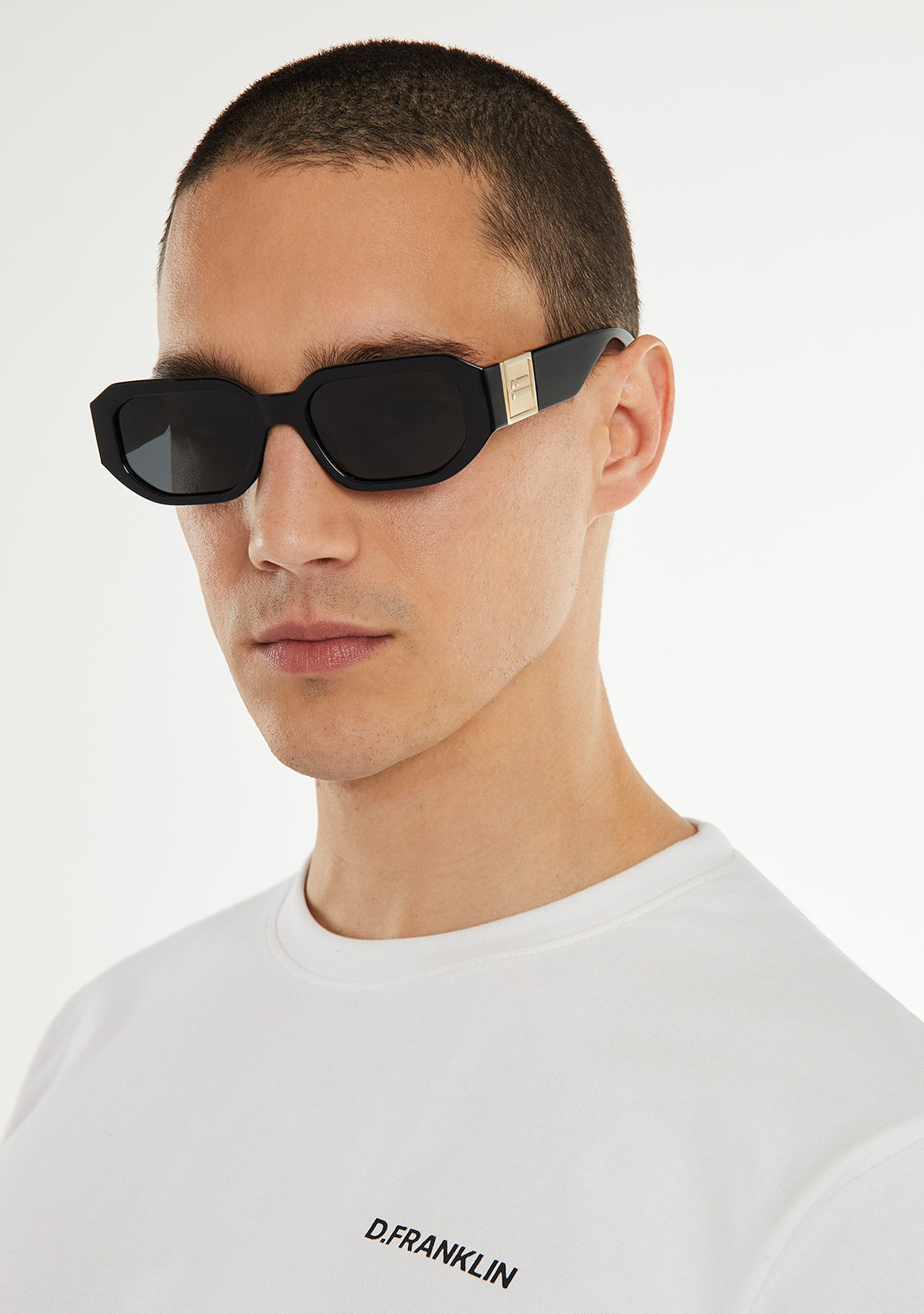 As lentes polarizadas escuras e a armação correspondente destacam a singularidade deste design. Apresenta a nossa distinta bandeira D.Franklin com um acabamento dourado metálico em ambas as hastes. A largura da lente de 52mm e a frente da armação de 139mm são unidas por uma haste assimétrica de 140mm.