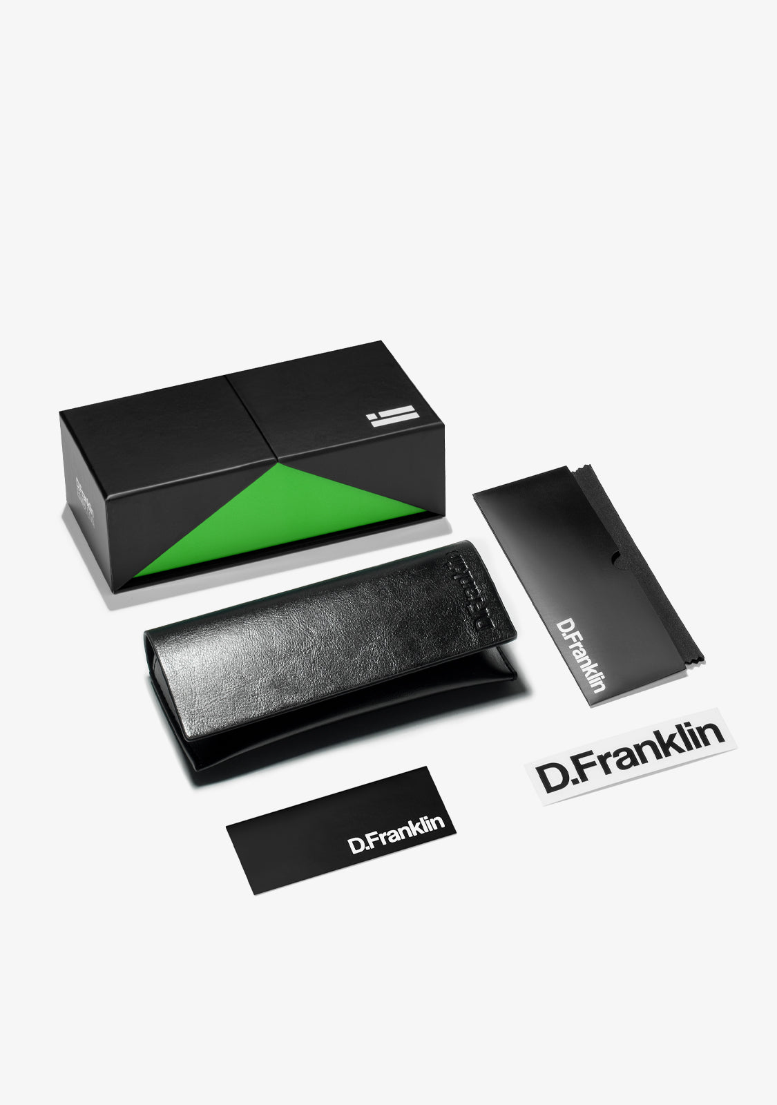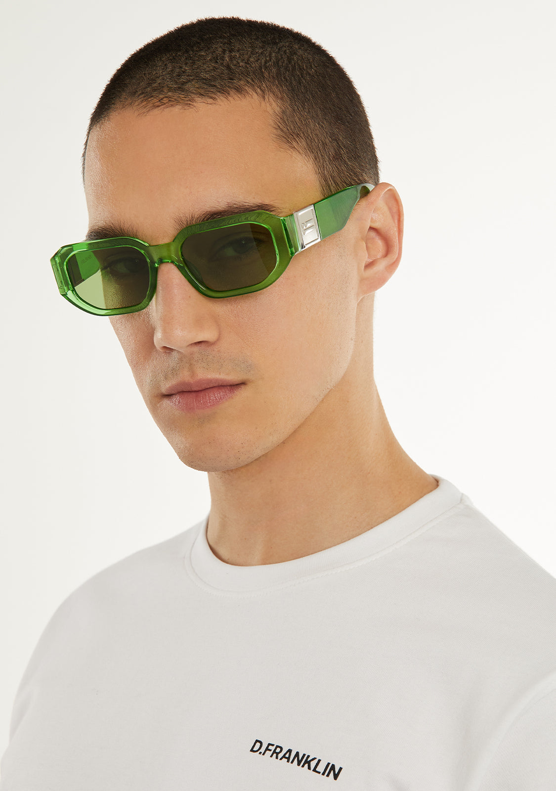 Lentes polarizadas verdes e armação correspondente destacam a singularidade deste design. Apresenta a nossa distinta bandeira D.Franklin com um acabamento dourado metálico em ambas as hastes. A largura da lente de 52mm e a armação frontal de 139mm são unidas por uma haste assimétrica de 140mm.