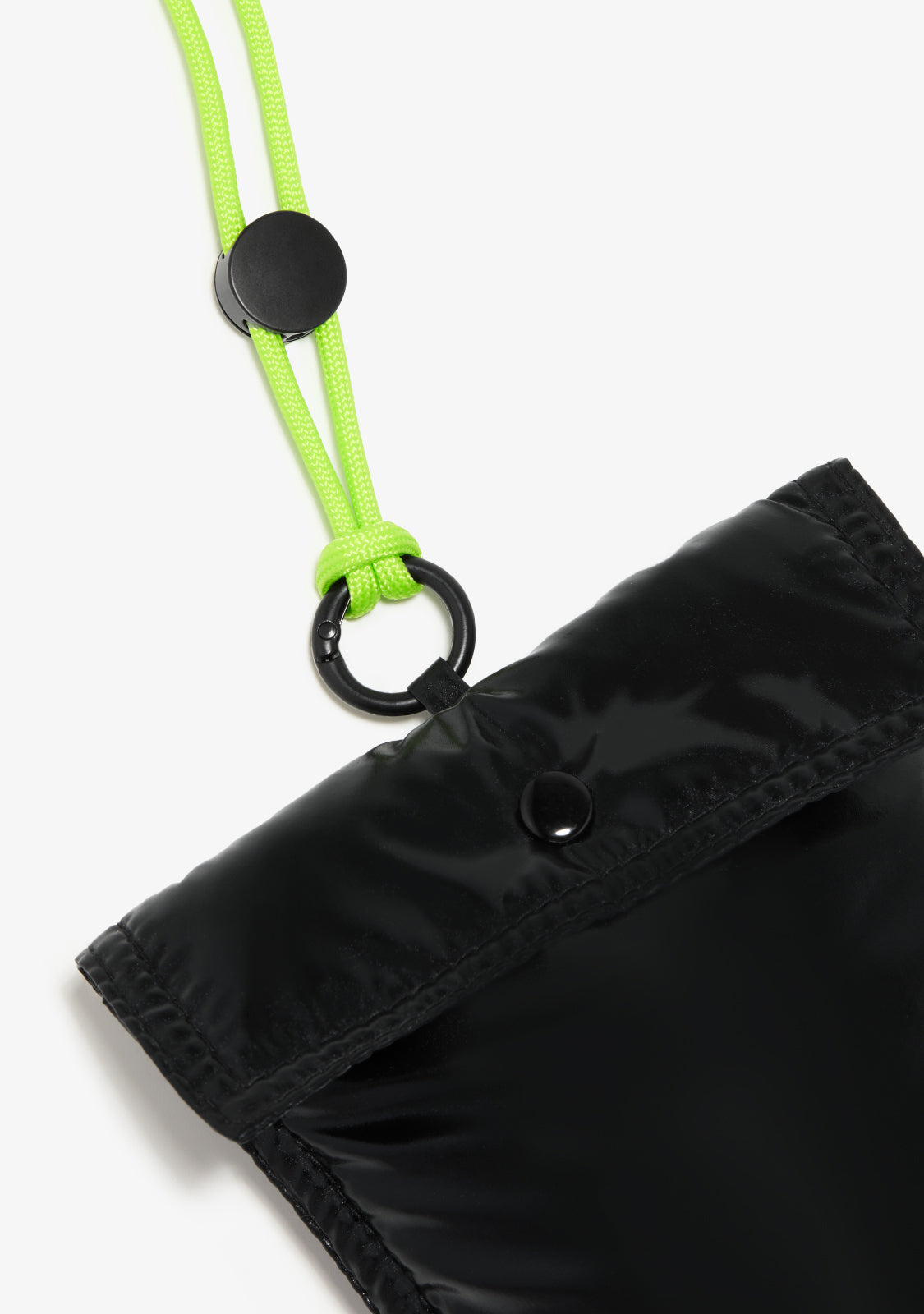 Este modelo com acabamento preto iridescente tem um cordão removível de cor lima, graças ao seu anel de metal que permite adaptar o seu comprimento. Apresenta um fecho de botão e um logótipo D.Franklin em serigrafia de cor lima na parte da frente.