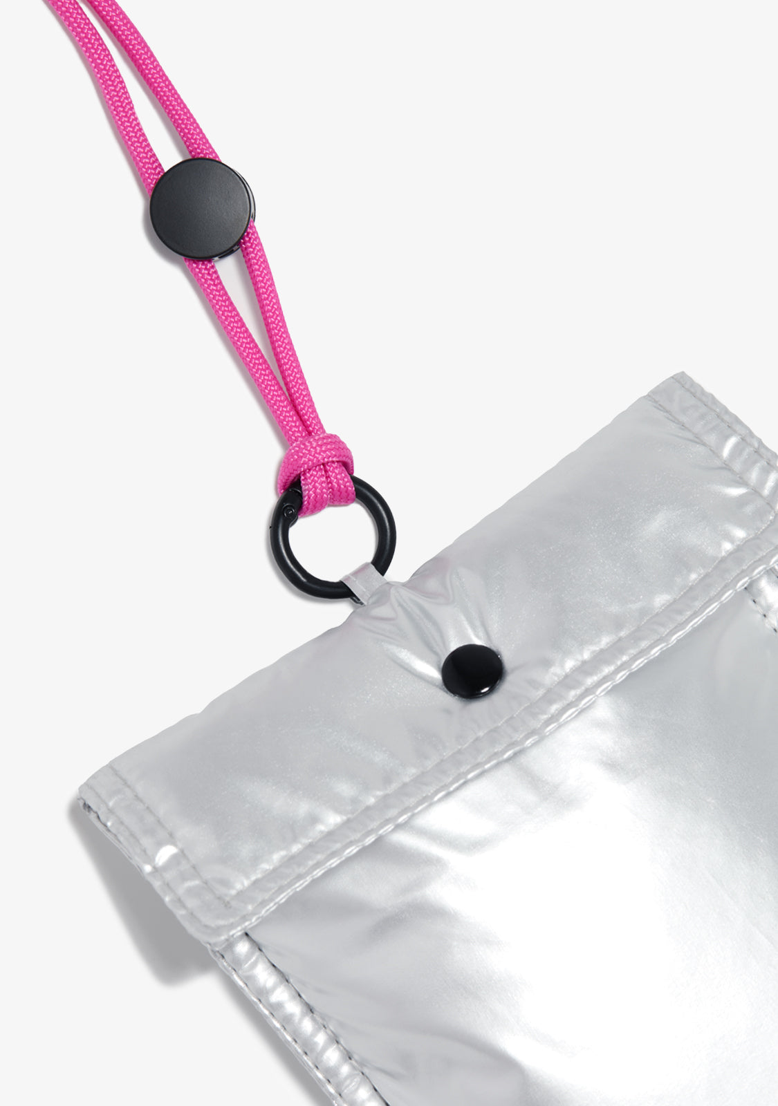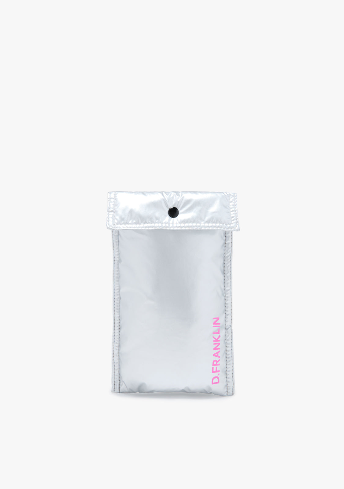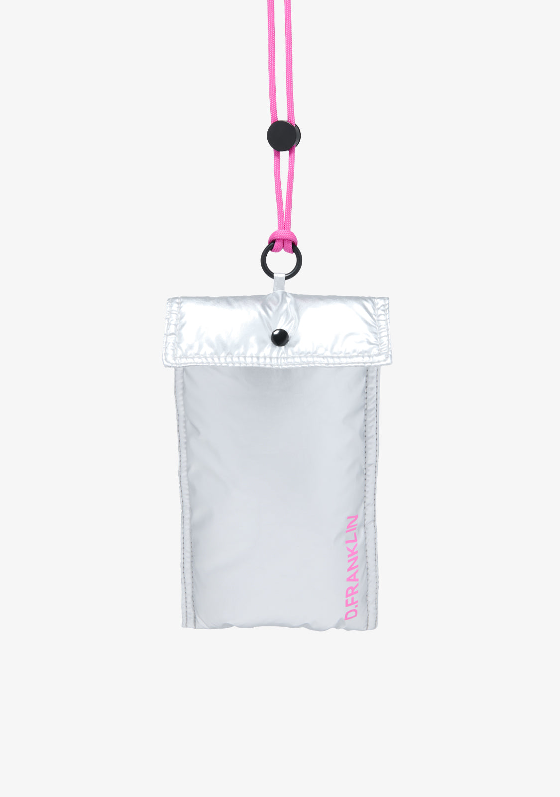 Este modelo com um acabamento prateado iridescente tem um cordão fúcsia removível graças ao seu anel de metal que permite adaptar o comprimento. Apresenta um fecho de botão e um logótipo D.Franklin em serigrafia fúcsia na parte da frente.