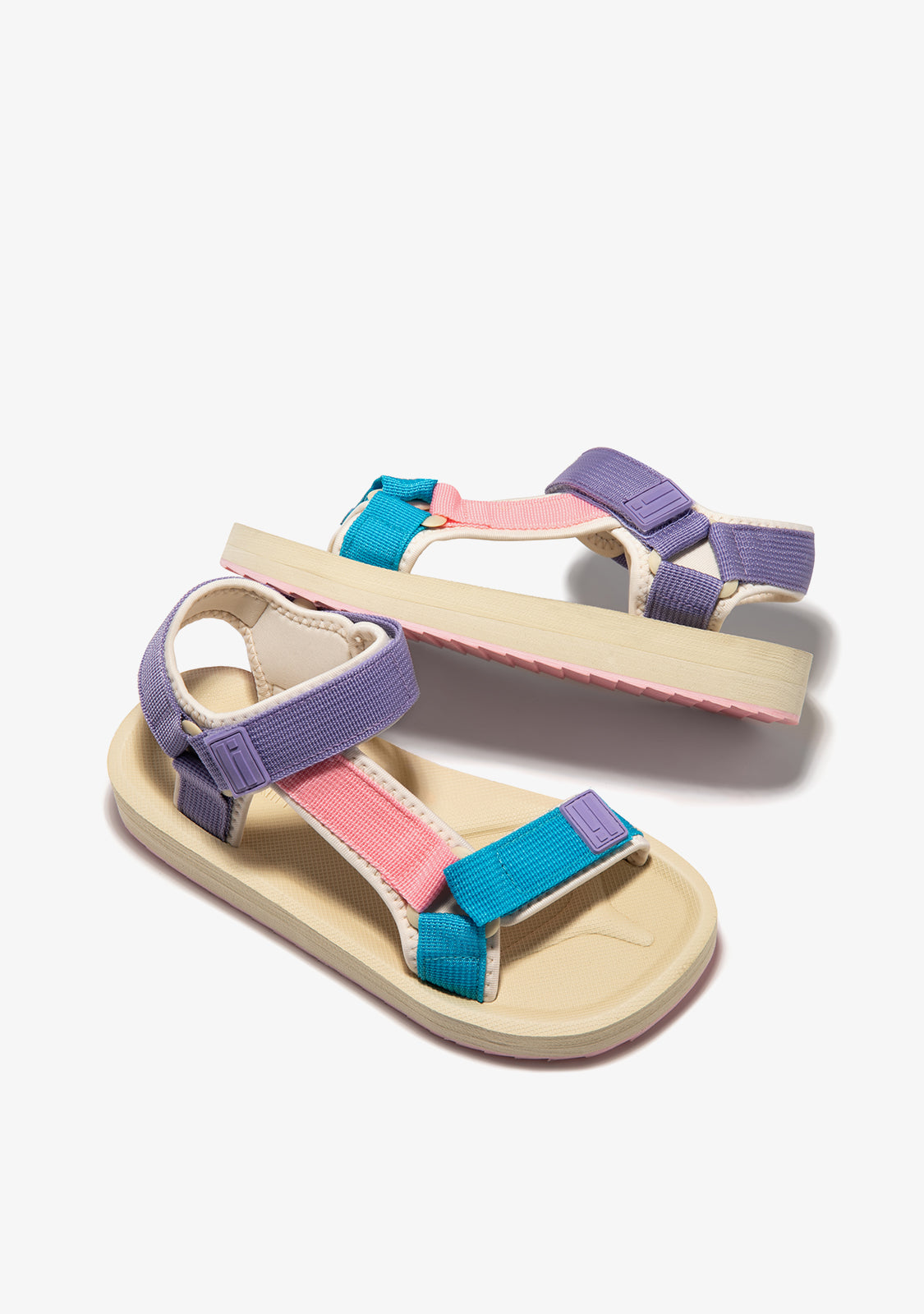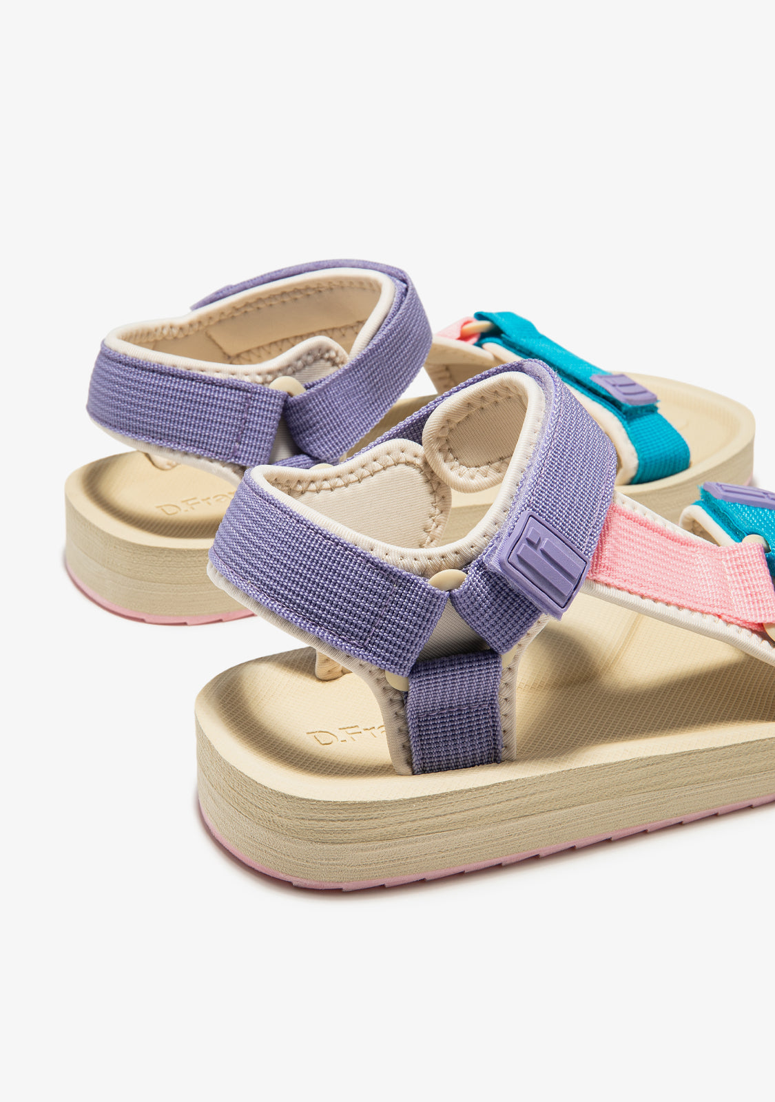 Inspiradas em dias passados ao ar livre. Este design apresenta fechos de fivela triangular e um fecho de fita adesiva. Tem um novo acabamento em ciano, rosa e roxo. Apresenta a marca D.Franklin tanto na sola como na lateral.
