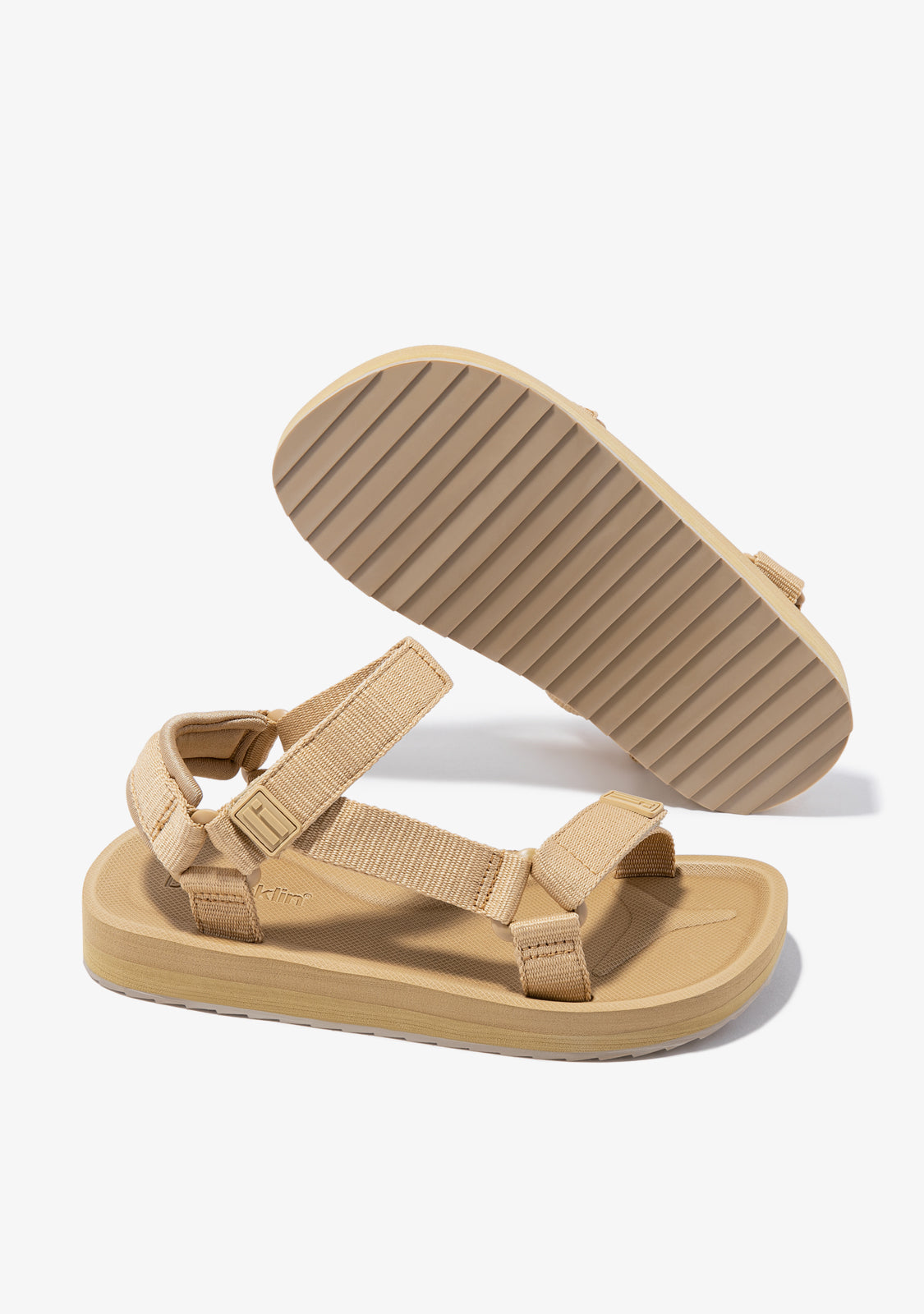 Uma fuga da cidade. Uma pausa da vida quotidiana. Design para descobrir novos lugares longe do conhecido. Sandália de estilo desportivo em cor bege com fecho por tira adesiva. Construída com sola de EVA para oferecer maior conforto.