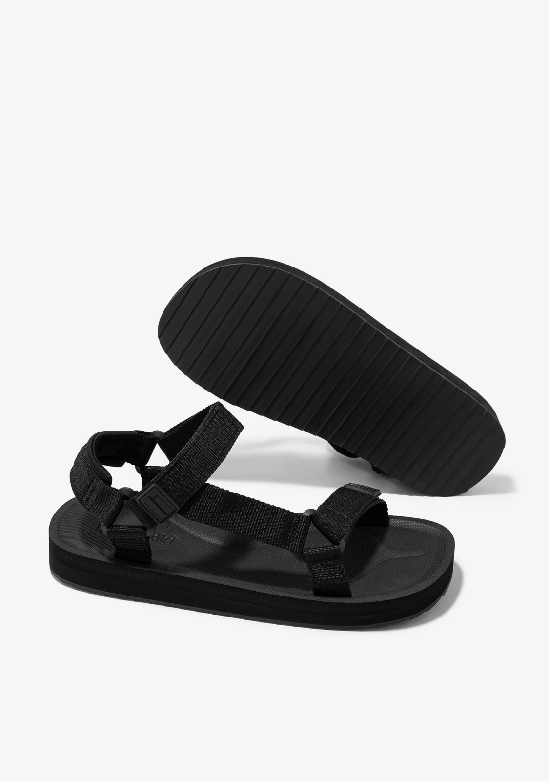 Uma fuga da cidade. Uma pausa da vida quotidiana. Design para descobrir novos lugares longe do conhecido. Sandália de estilo desportivo com fecho de fita adesiva preta. Construída com sola de EVA para oferecer maior conforto.