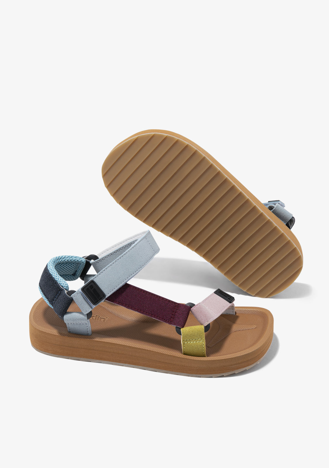 Uma fuga da cidade. Uma pausa da vida quotidiana. Um design com o qual descobrir novos lugares longe do familiar. Sandália de estilo desportivo com uma fivela em combinação de cinza, fúcsia e amarelo sobre uma sola castanha. Construída com sola de EVA para conforto.