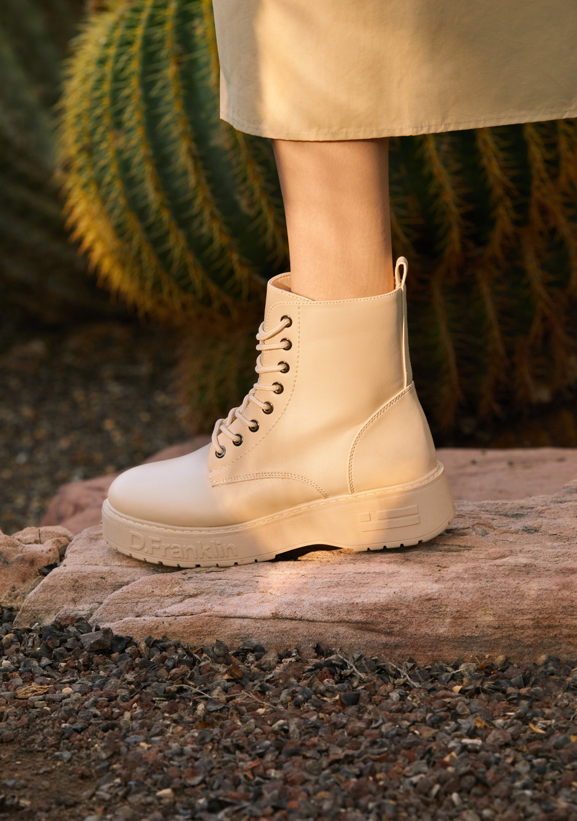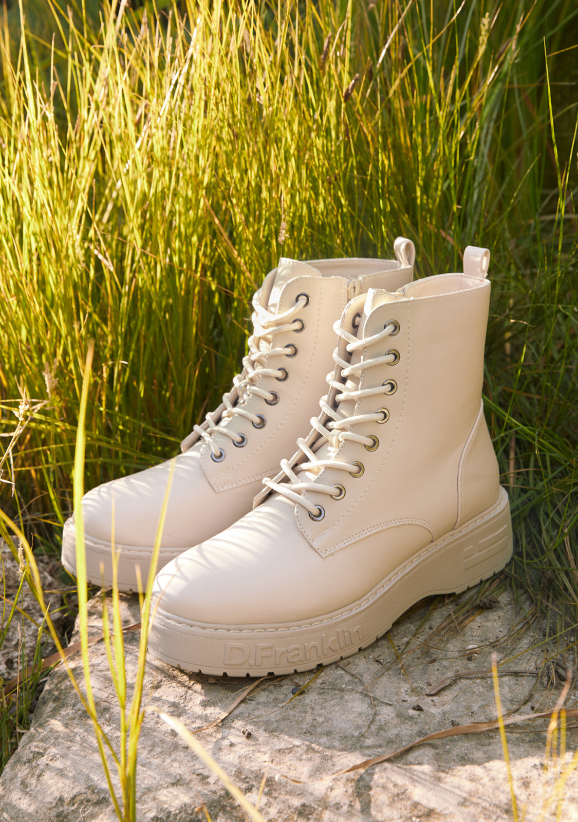 Este modelo bege D.Franklin apresenta um fecho de correr interior de um lado e atacadores de algodão ajustáveis. A sola estilo track proporciona uma aderência incomparável. O logótipo em relevo e a personalização do emblema na cunha e na biqueira.