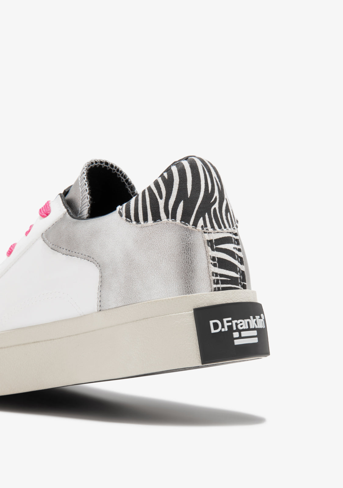O modelo Half Moon captura a estética estelar ao combinar texturas brilhantes em tons de prata e lima e padrão de zebra. Apresenta um cabedal acolchoado e um fecho de atacadores rosa. Também apresenta letras personalizadas tanto na lateral como no calcanhar.