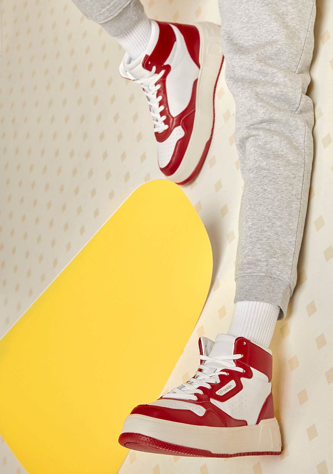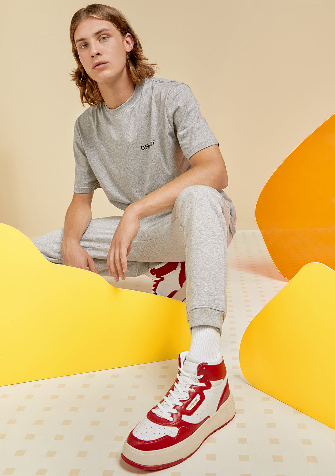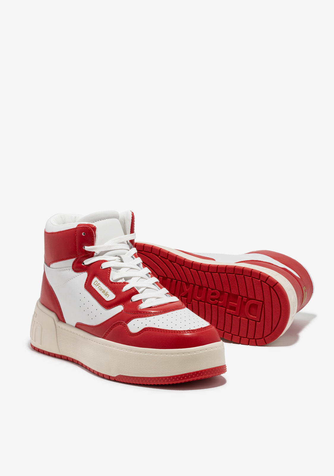 Os ténis Court D.Franklin são feitos com detalhes em vermelho e atacadores de algodão. A sola contrastante apresenta um logótipo em relevo tanto no calcanhar como na sola. Têm 4cm de altura e uma sola em phylon para um amortecimento leve.