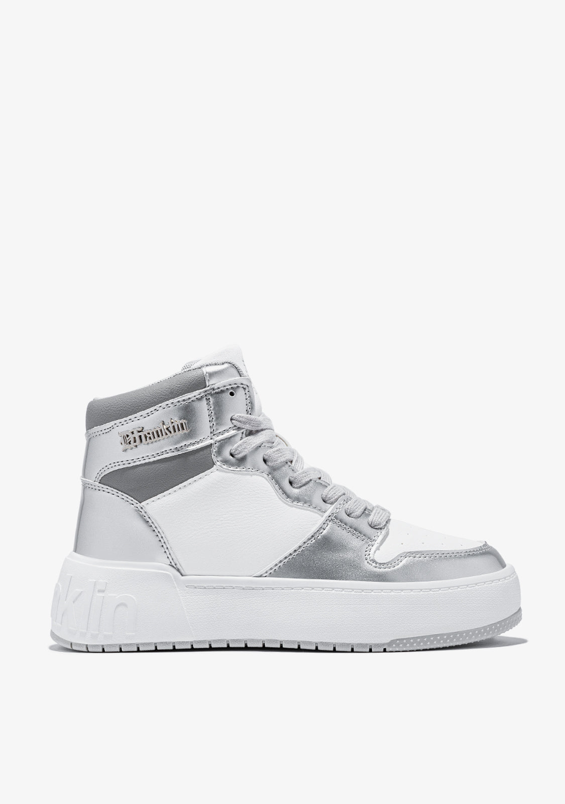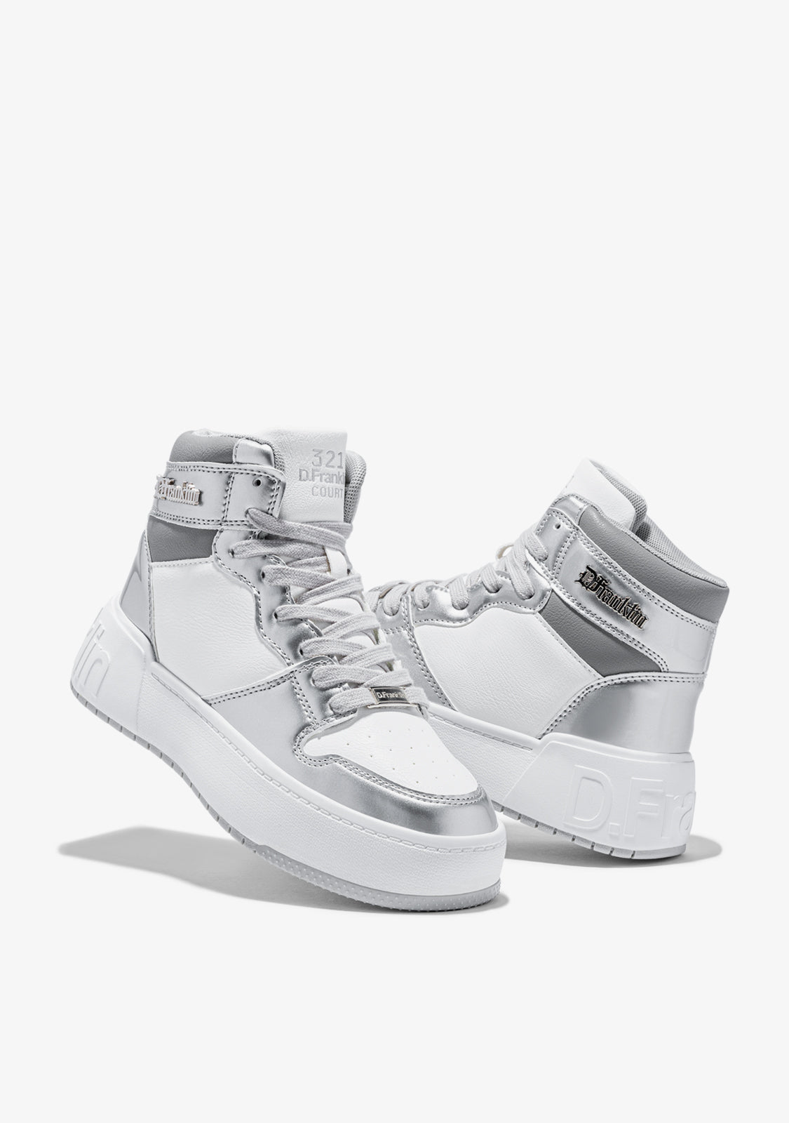 Apresentamos A Coleção Court da D.Franklin. Um novo modelo inspirado no desporto, criado para oferecer um design ousado e versátil. Agora, com um design hi-top, o High Court White / Silver é caracterizado por uma reinterpretação da linha clássica de camadas, com uma combinação de branco e prata.