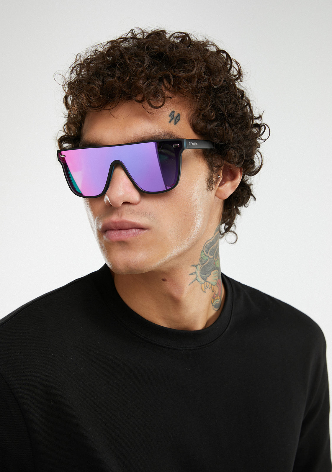 Lentes de policarbonato rosa e contornos pretos mate definem a essência das suas características. Apresenta os nossos detalhes característicos D.Franklin: o logótipo gravado nos lados frontais esquerdo e direito e o nosso emblema em ambas as hastes. Com uma largura de lente de 140mm e uma armação frontal de 144mm, estes óculos realçam as características de qualquer rosto. As hastes laterais têm 149 mm de comprimento e são feitas de materiais hipoalergénicos e resistentes.
