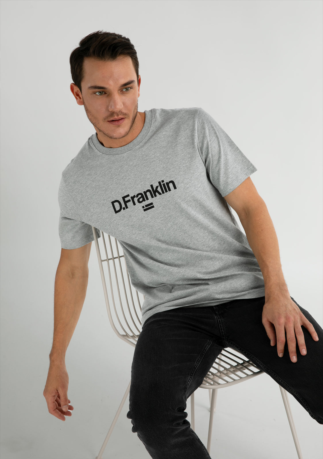 T-shirt cinza que simplifica a iconografia de D.Franklin com o logo e emblema da nossa marca no peito em preto. Gola redonda com costura dupla. Feita de 100% algodão orgânico.