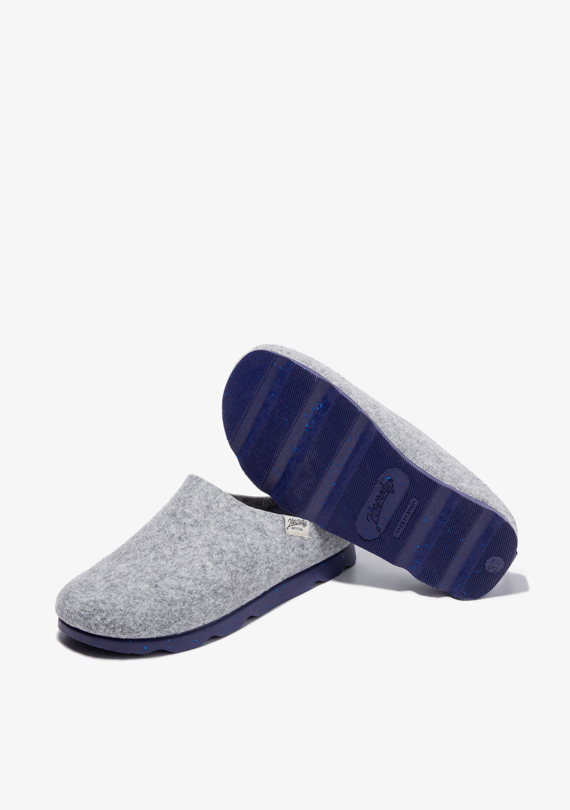 Proteja-se do frio com este design feito de materiais reutilizáveis. A parte superior em feltro de PET reciclado apresenta um tom cinza com pequenos detalhes em azul marinho. A sola contrastante é feita de borracha natural bicolor feita a partir de partículas recicladas.