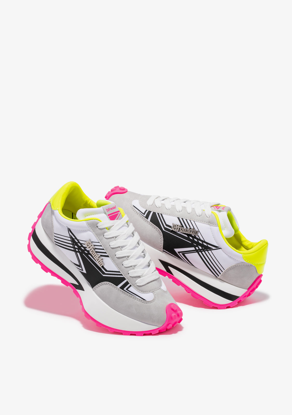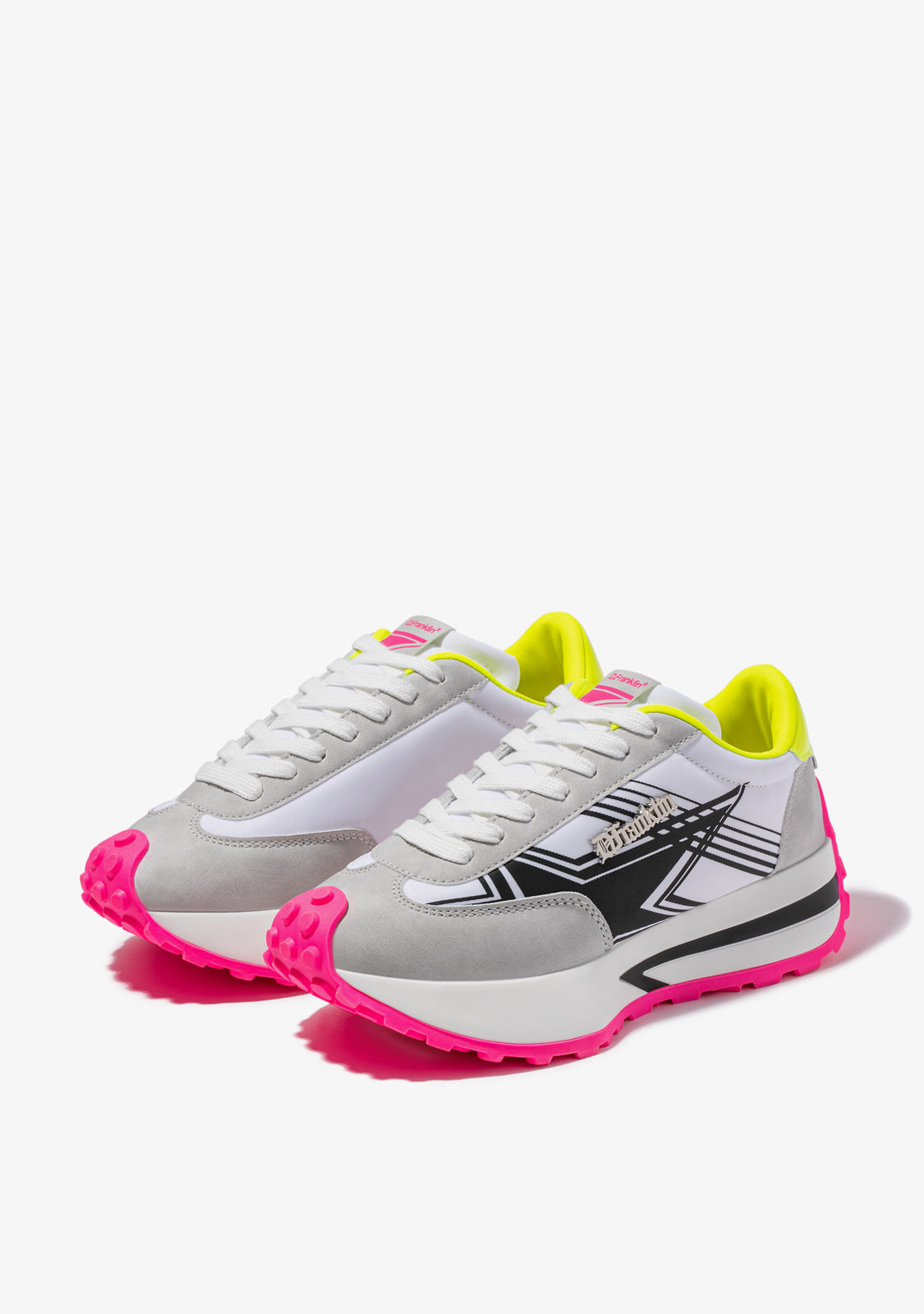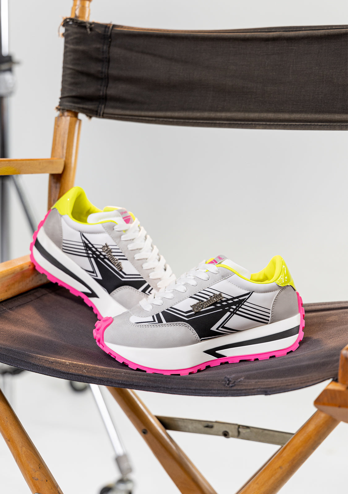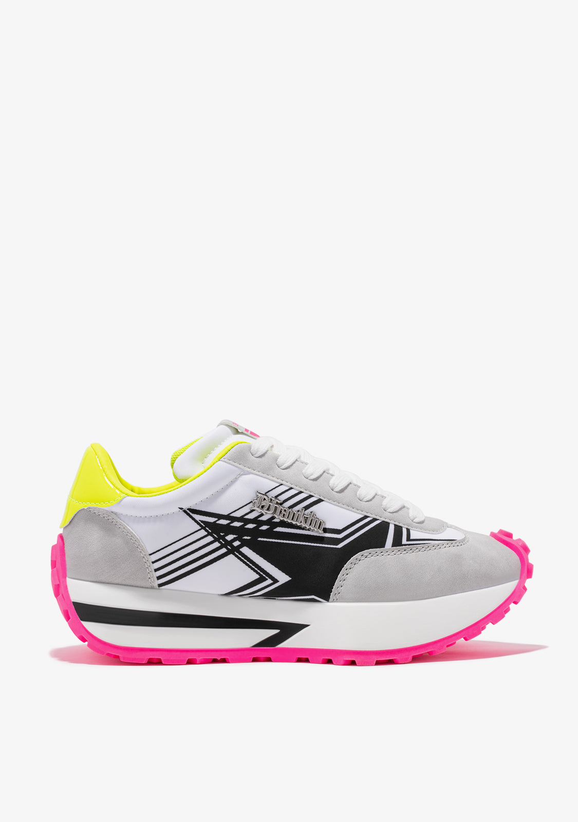 Sapatilha inspirada no ritmo da cidade. Design em tendência construído a partir de materiais livres de crueldade. Estampa de estrela lateral em cinza. Detalhe em metal banhado de D.Franklin. Plataforma branca de 4 cm. Sola especial TR antideslizante em fúcsia.