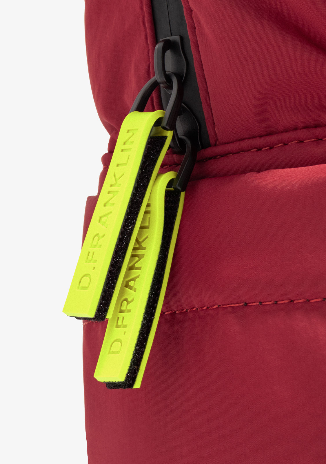 O exterior inclui dois bolsos laterais, ideais para itens como uma garrafa de água ou um guarda-chuva. Além disso, tem dois bolsos menores com fecho: um na parte frontal superior e outro na área de trás. Na mesma seção traseira, há também uma alça de nylon com a inscrição D.Franklin, projetada para se prender à sua bagagem. Também vem com cordões frontais intercambiáveis com um stopper de metal, um emblema de bandeira e um fecho superior com zíper com acabamentos semelhantes a alças.