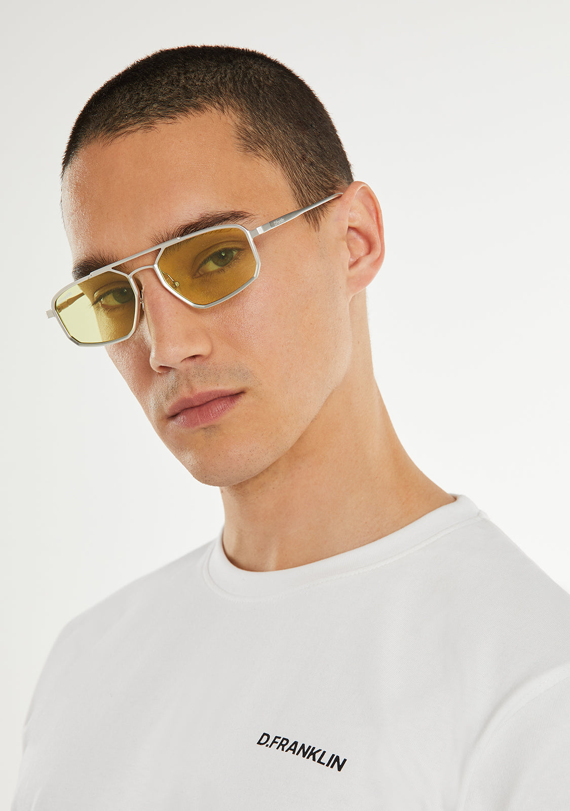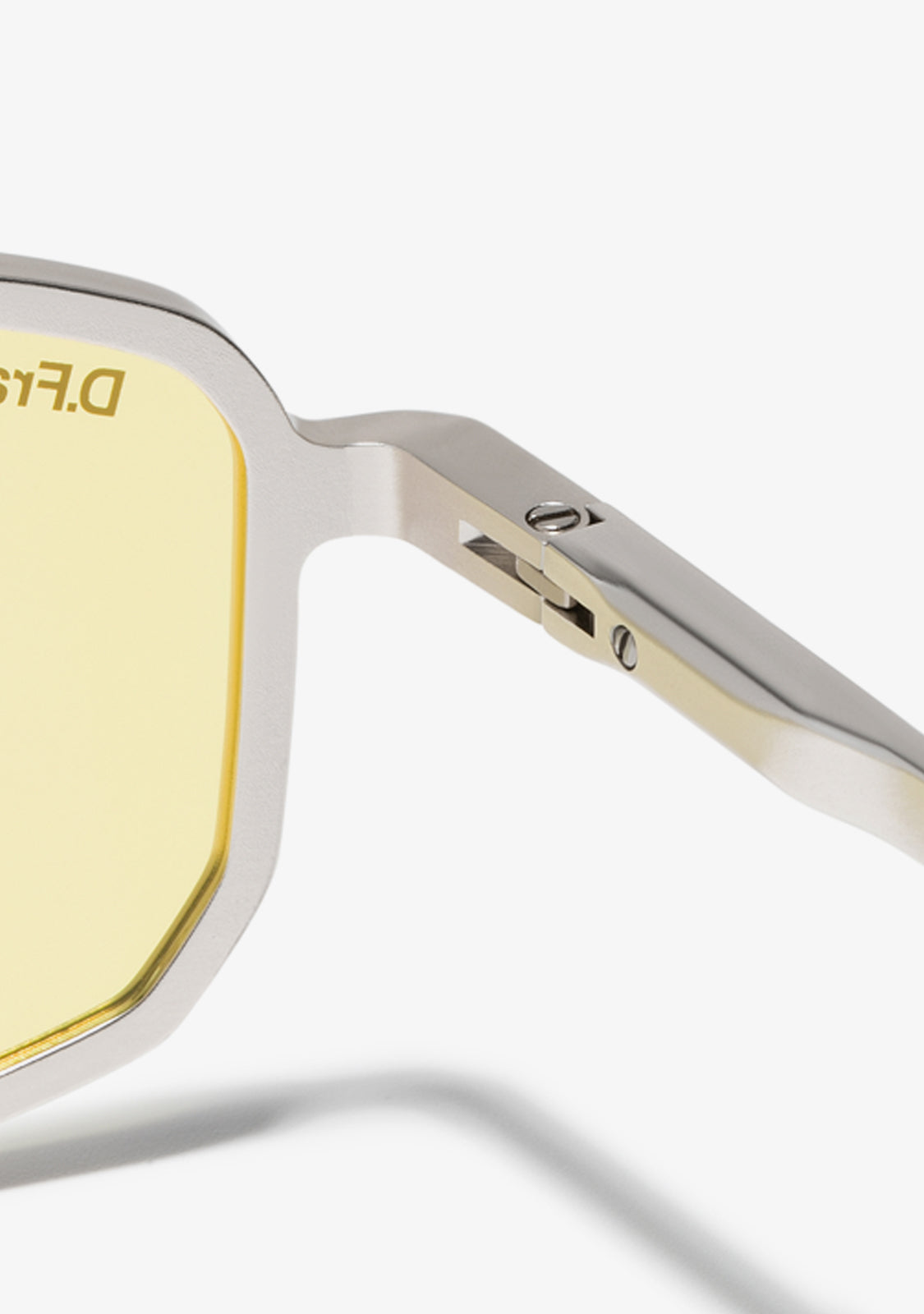 Graças à sua construção em alumínio, estes óculos são ultra-leves. Apresentam lentes polarizadas amarelas e uma armação prateada que reforça a sua estética característica. O design apresenta o nosso emblema na lente direita e o logótipo metálico na lateral das hastes. Tem uma armação frontal de 143 mm e uma largura de lente de 52 mm, que se adapta à maioria dos rostos. As hastes têm 138 mm de comprimento.