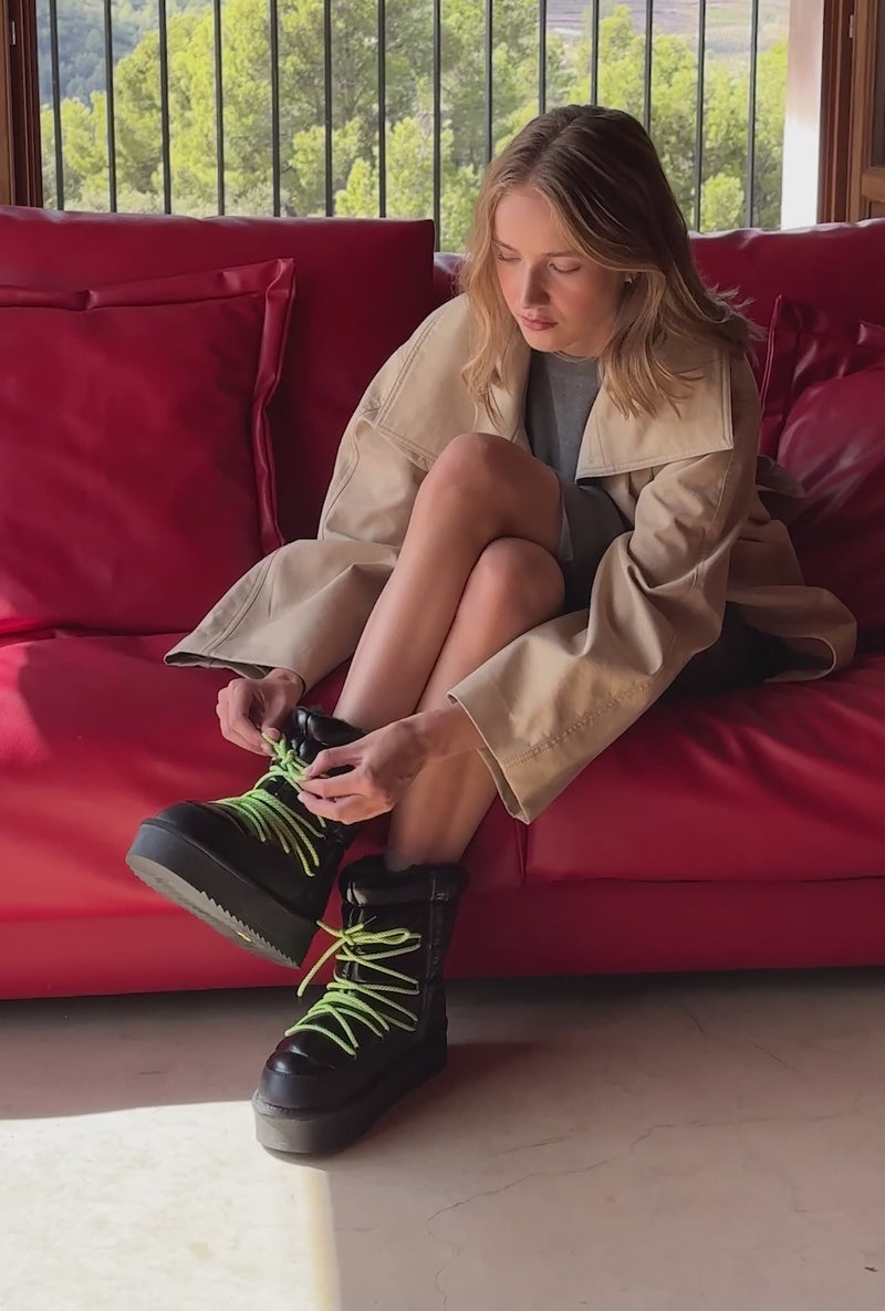 Definimos dias frios com uma peça quente e distinta. Este modelo é feito com tecidos de alta qualidade, leves e flexíveis. A sua sola de dupla altura proporciona grande conforto. Além disso, apresenta o nosso emblema personalizado tanto no calcanhar como na lateral. Os seus atacadores verdes garantem um ajuste perfeito e suporte, incluindo detalhes refletivos.