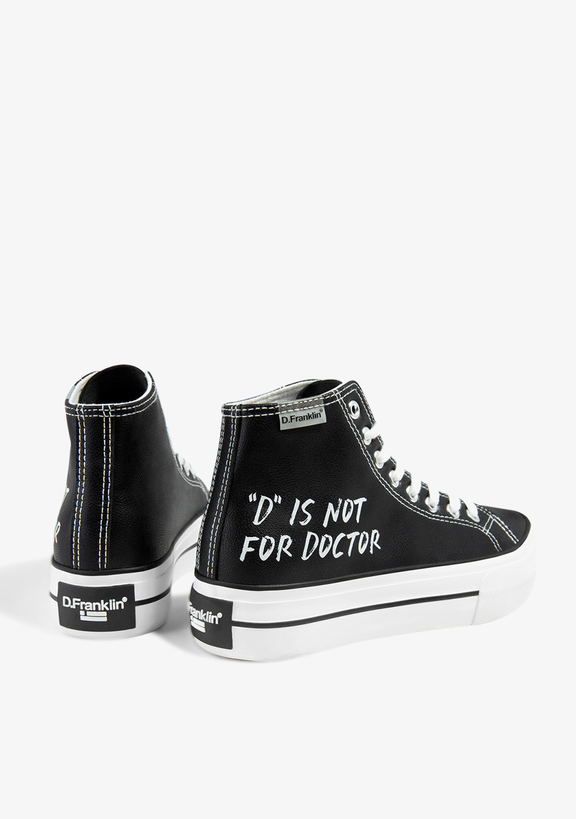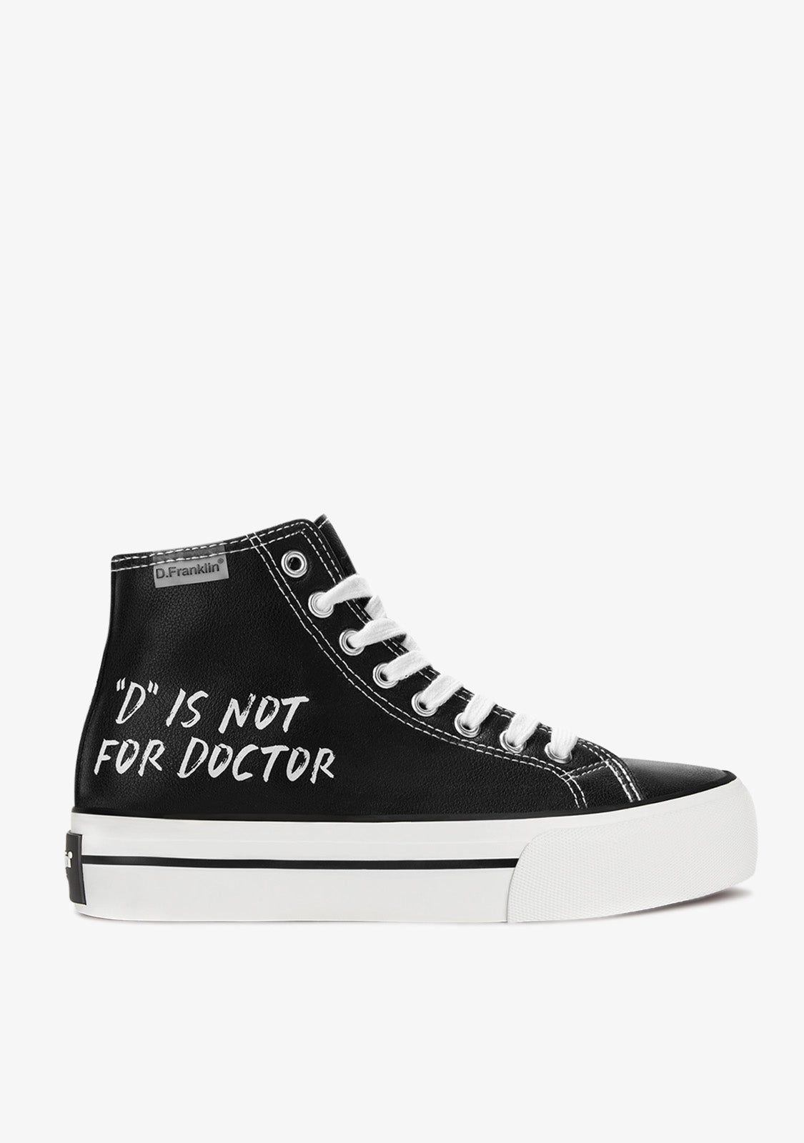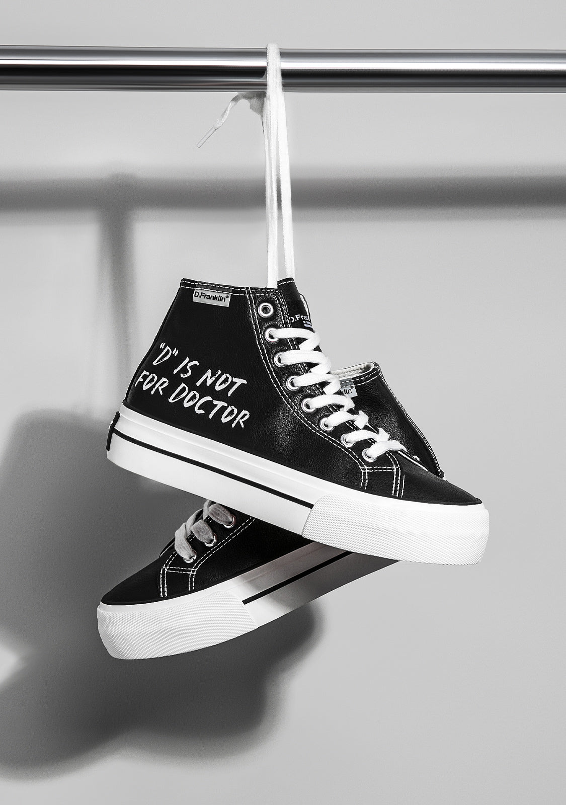 A edição limitada One Way é inspirada nas coleções mais casuais, combinada com a personalidade e o estilo mais marcado da D.Franklin®. Os One Way D Is Not Black são os ténis Hi-top perfeitos para todos os tipos de novas estradas. Um modelo de estilo urbano que combina tendências atuais com detalhes originais dos seus materiais. Feitos de couro sintético preto, desenhados a partir da nossa afirmação ‘D is not for Doctor’.
