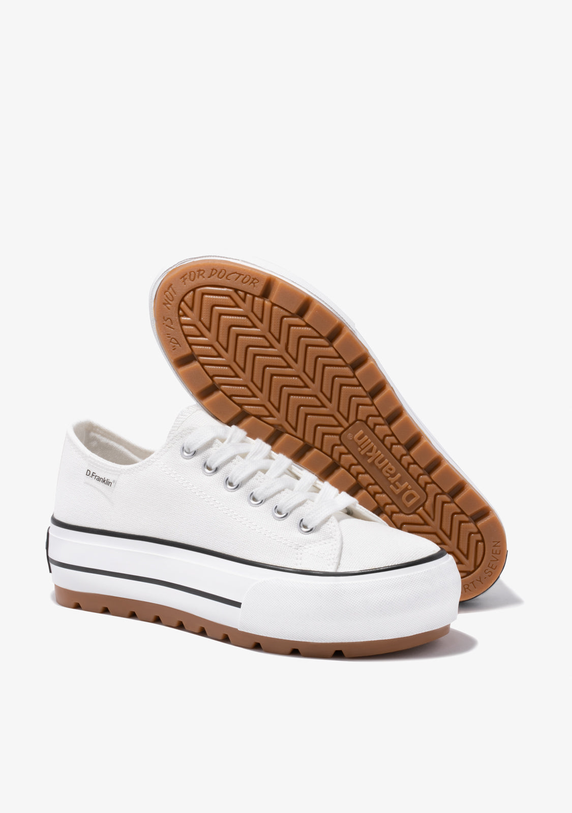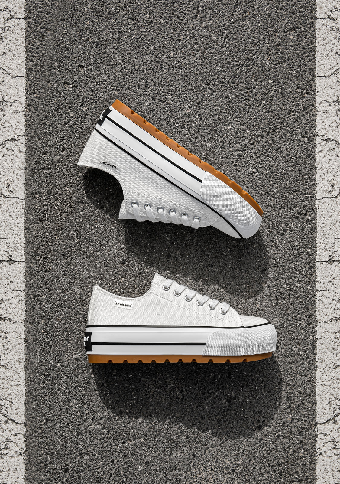 Uma nova forma de criar o seu caminho. Inspirado nos clássicos One Way ténis, com uma essência intemporal. Projetado com têxtil reciclado em branco. Construído com uma sola branca leve de 5cm de aderência extra. Logotipo preto em relevo no calcanhar. Cadarços de algodão brancos para um look básico.