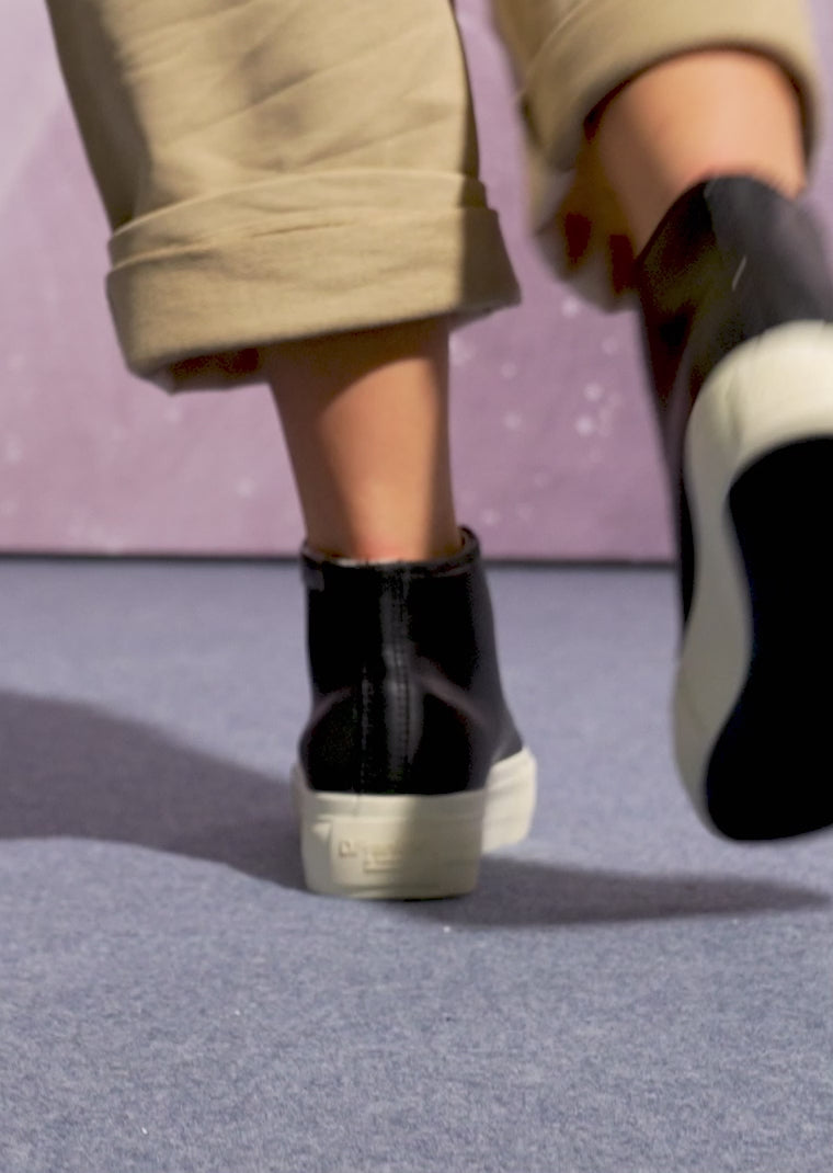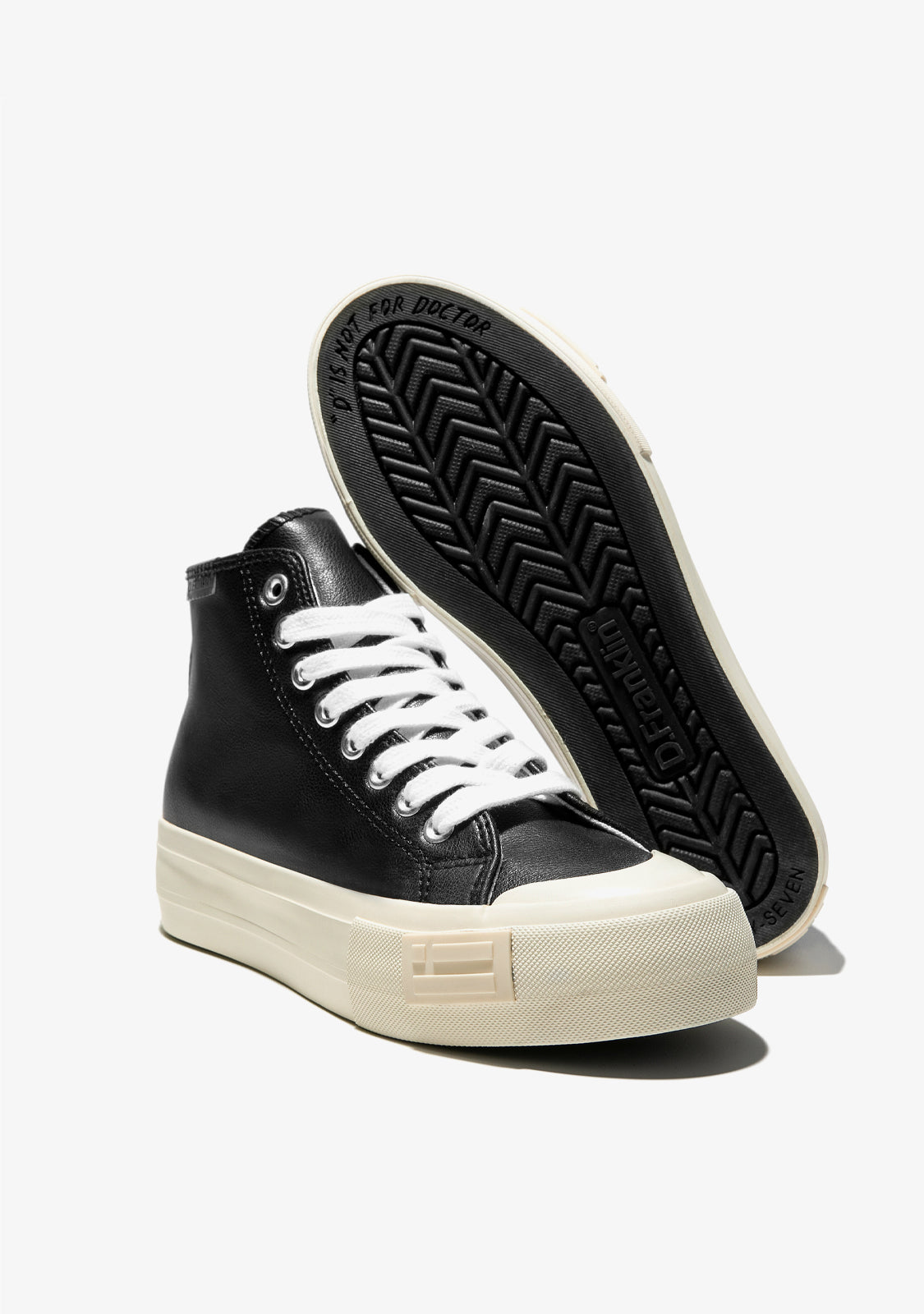 O design de cano baixo é construído em couro sintético preto e microfibra. Sola de borracha monocromática de 4cm branca com emblema D.Franklin no topo do cano e lettering da marca no calcanhar.